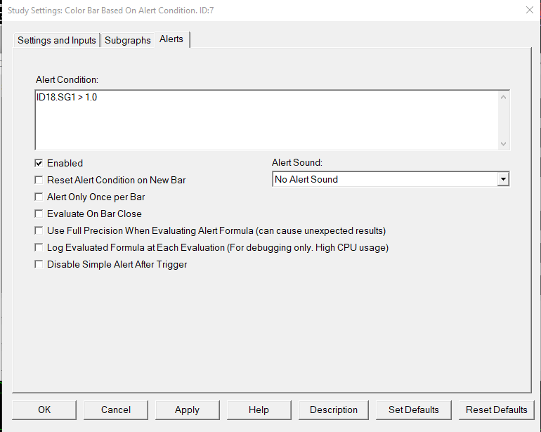 Use the following formula for the alert in the "Color Bar Based on Alert Condition" study: ID1.SG1 > 0.2 Where ID1 is the ID of the study that draws the line and SG1 is the subgraph of the study that is the line. Refer to the following: Color Bar Based on Alert Condition For the most reliable, advanced, and zero cost futures order routing, use the Teton service: Sierra Chart Teton Futures Order Routing |