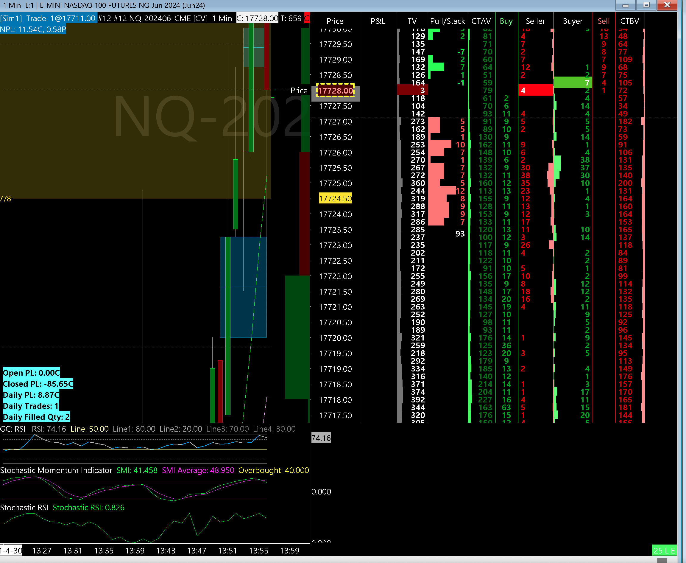 Instruments such as NQ and other volatile assets do not perform well in candlestick charts in the lower timeframe of 30 seconds or 1 minute with the DOM on. If you want to see DOM then you cannot see the chart well, if you want to see DOM well then yu cannot see the chart well. Please see my screenshot again to understand. Out of two scenarios, I am attaching screenshot for the second scenario. First scenario screenshot is there in my previous post. Rather than this, when scale is in interactive mode, the data in the dom should be following the price scale and show aggregated data at different scale levels in the increment of the tick of the corresponding instrument. Date Time Of Last Edit: 2024-04-30 18:00:10