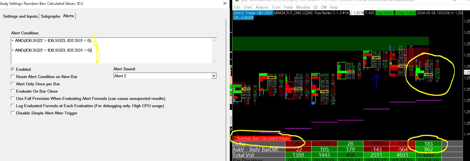 Let do it simply. If renko flex bar (price) close below POC with a positive delta = I want an alert (see the picture attach). I cannot find the good formula, can you please help me.... i WOuld like insert the alert formula inside Number of Bar calculated Value Study. |
