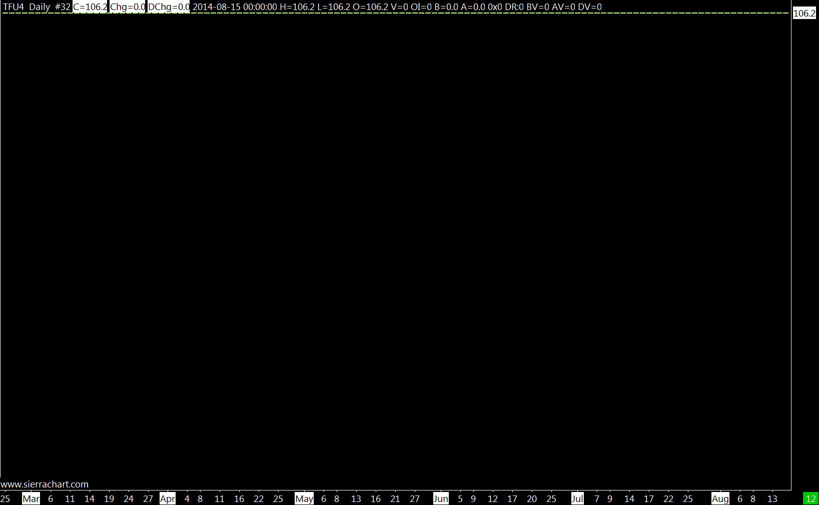 TFU4 is not a valid futures contract symbol for the service you are using. Open a new chart through File >> Find Symbol and locate the proper symbol. Sierra Chart Support - Engineering Level Your definitive source for support. Other responses are from users. Try to keep your questions brief and to the point. Be aware of support policy: https://www.sierrachart.com/index.php?l=PostingInformation.php#GeneralInformation For the most reliable, advanced, and zero cost futures order routing, *change* to the Teton service: Sierra Chart Teton Futures Order Routing |