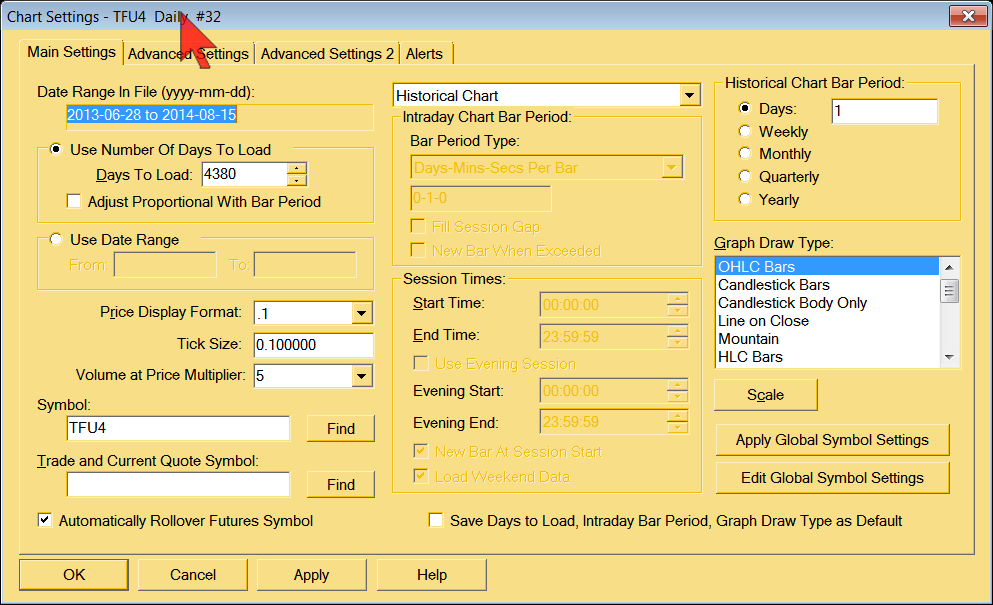 We do not recommend using that symbol it is not clear what contract month it is near the expiration of the contract. We recommend opening a Historical Daily chart through File >> Find Symbol and the appropriate symbol will be selected. Sierra Chart Support - Engineering Level Your definitive source for support. Other responses are from users. Try to keep your questions brief and to the point. Be aware of support policy: https://www.sierrachart.com/index.php?l=PostingInformation.php#GeneralInformation For the most reliable, advanced, and zero cost futures order routing, *change* to the Teton service: Sierra Chart Teton Futures Order Routing Date Time Of Last Edit: 2014-08-18 17:27:22