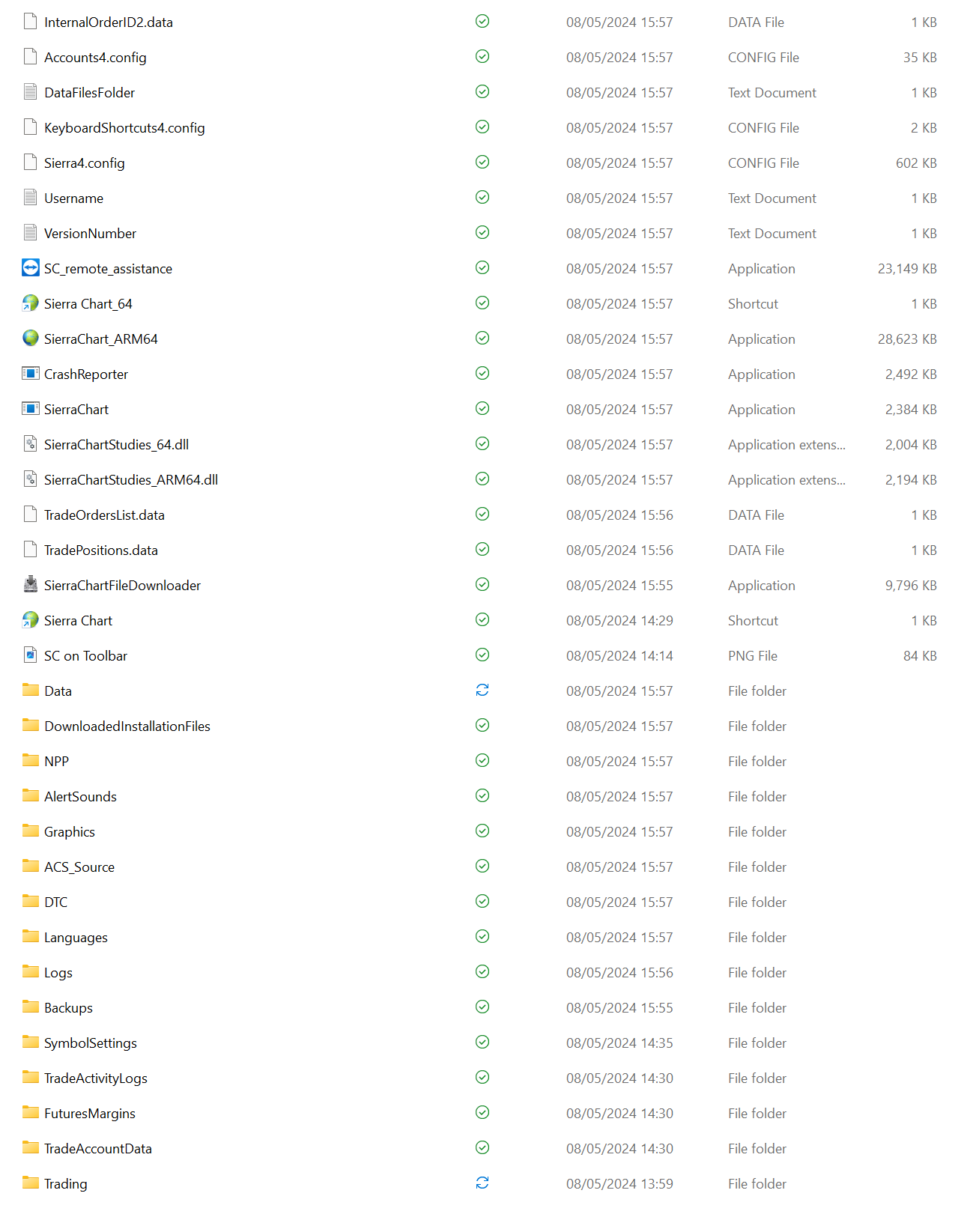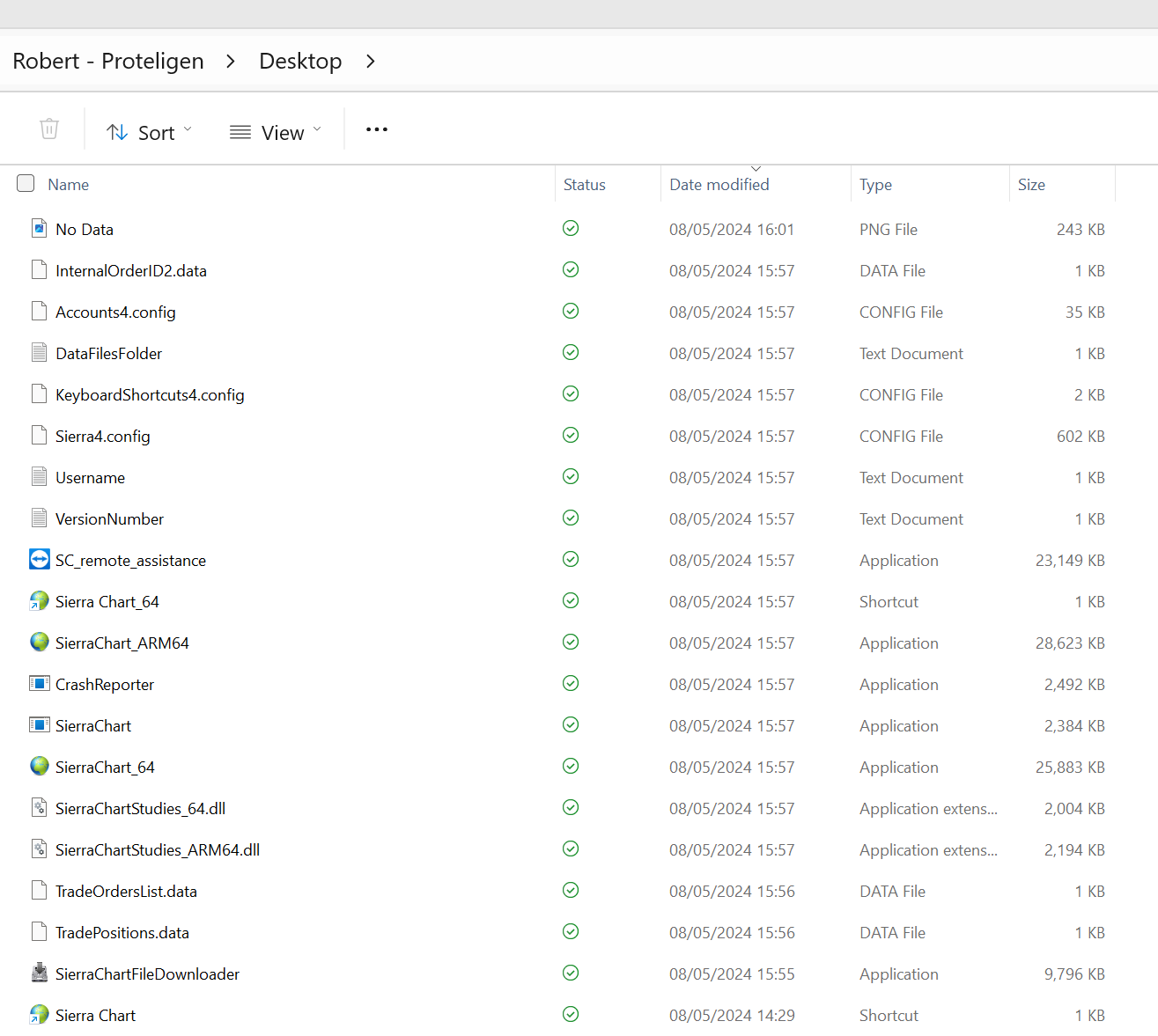 John all the folders and the files that were in the main SierraCharts folder were "copied" to my desktop. All the original files remain in the original folder including 'Sierra4.config'. For now I've moved back SierraChart_64 as I would be duplicating everything otherwise. What's my next move? Reinstall Sierra Charts, then look to create the desktop shortcut? If so, how do I re-install? Just conscious that I have 2 Sierra Charts on my computer, one for Broker, one for Prop. I have uploaded another image showing SierraCharts folder with all the files in there. Date Time Of Last Edit: 2024-05-08 16:16:26