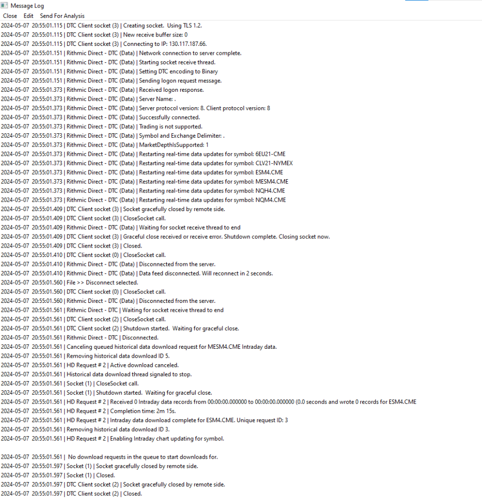 Hello, I am experiencing an issue with my Rithmic connection. It was working two days ago, but then it suddenly stopped. I have tried opening a clean chartbook with the ESM4.CME chart, but I am still encountering the same problem. I have attached the message log. Thank you, Date Time Of Last Edit: 2024-05-08 07:44:55