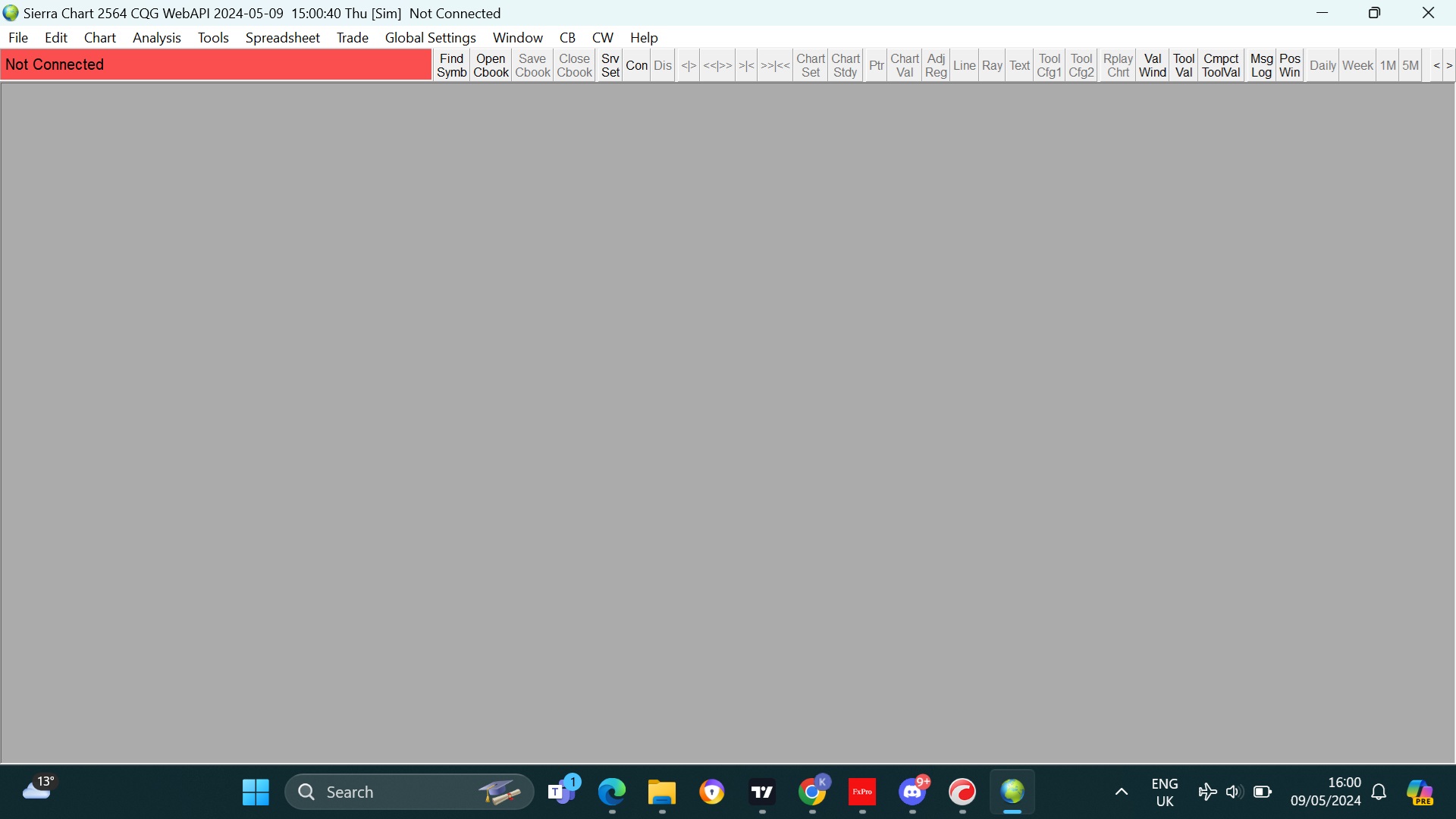 To begin with, you are not connected to your trading service. Select "File >> Connect to Data Feed". If you are having a problem connecting, then we would need to know if you are getting any error messages and what they state. It also appears that you do not have any chartbooks open. Select "File >> Open Chartbook" to open a chartbook or "File >> Find Symbol" to create a new chart. For the most reliable, advanced, and zero cost futures order routing, use the Teton service: Sierra Chart Teton Futures Order Routing |