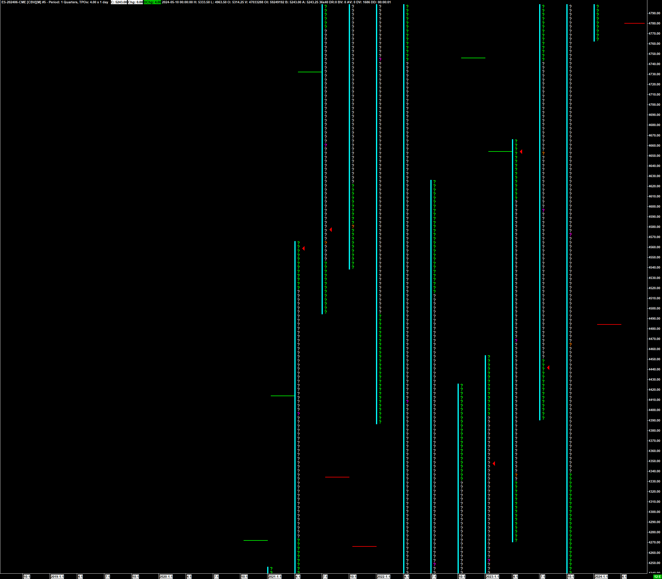 SC 2634 Symbol: ES, volume-based rollover - back adjusted Base chart: Historical, daily Study: TPO, quarterly current study settings (the problem is also with any other choice of settings): 16 tick increment, letter Resulting chart displays only one column per period and all letters are question marks: https://www.sierrachart.com/image.php?Image=171529293414.png There is no problem when using yearly, monthly, or weekly profile time period lengths. The problem just shows for the quarterly TPO chart. |