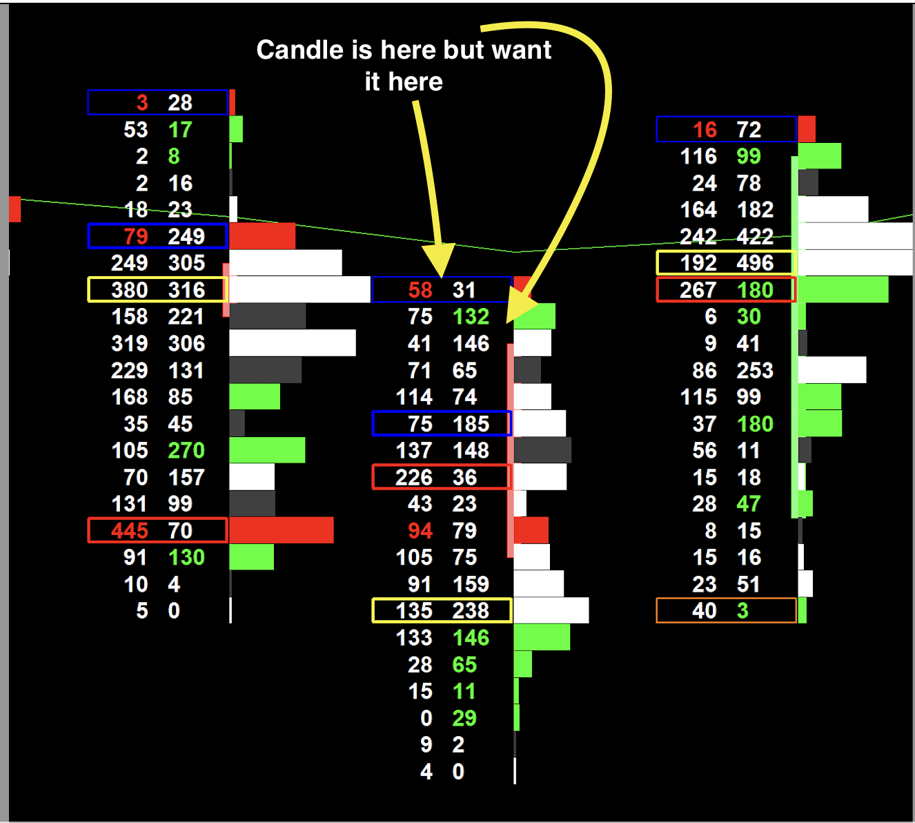 Hi Yes, I tried changing that variable too, but the lowest value of "1" still spreads the body/background of the candle across both Bid/Ask values of column 1 unfortunately instead of containing the body between those two values of the footprint. Suggestions? |