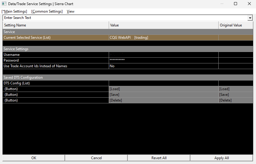 What is Global Settings >> Data/Trade Service Settings >> Current Selected Service set to?