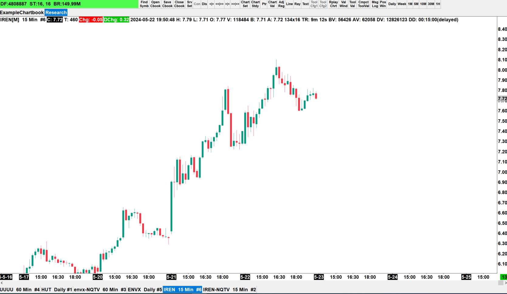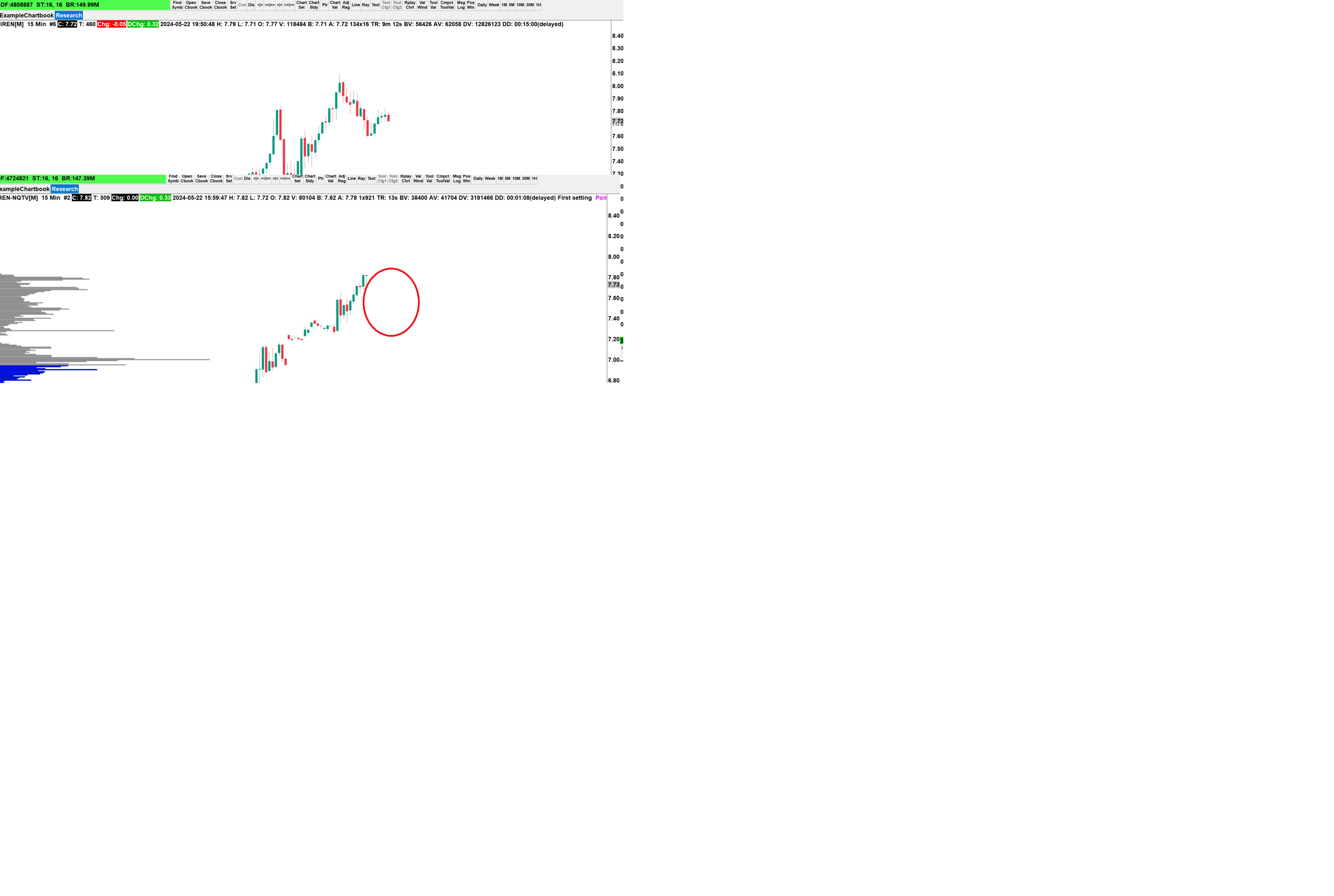 The two charts you show have the standard symbol (IREN) and the NASDAQ TotalView symbol (IREN-NQTV). You are only setup to get real-time data for the NASDAQ TotalView exchange, therefore when you enter a symbol with the -NQTV suffix, you will get the real-time data, and if you do not use the -NQTV suffix, you will get the delayed streaming data from our U.S. Equities Consolidated Tape exchange. Refer to the following: Denali Exchange Data Feed: Nasdaq TotalView Data Feed Notes Given the above, we do not know what we are supposed to be looking at in terms of lagging candles, nor do we have enough information to understand. Keep in mind the candles will be different between the two data sources (NASDAQ TotalView and U.S. Equities Consolidated Tape) as they are different data. For the most reliable, advanced, and zero cost futures order routing, use the Teton service: Sierra Chart Teton Futures Order Routing |