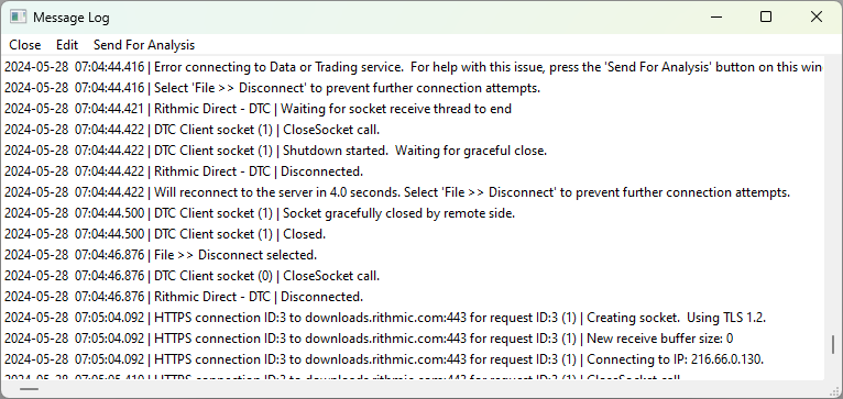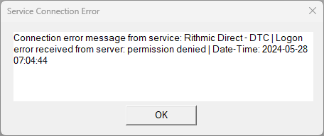 Hi, I can't connect to my rithmic data feed even though password and username is correct. this is what my message log shows when i try to connect: 2024-05-28 07:22:56.320 | Trade activity files set size: 1142 2024-05-28 07:22:56.330 | HTTPS connection ID:1 to downloads.rithmic.com:443 for request ID:1 (4) | Creating socket. Using TLS 1.2. 2024-05-28 07:22:56.330 | HTTPS connection ID:1 to downloads.rithmic.com:443 for request ID:1 (4) | New receive buffer size: 0 2024-05-28 07:22:56.330 | HTTPS connection ID:1 to downloads.rithmic.com:443 for request ID:1 (4) | Connecting to IP: 216.66.0.130. 2024-05-28 07:22:56.372 | Created the DTC Protocol server. 2024-05-28 07:22:56.373 | DTC Protocol Server listening on port 11099. 2024-05-28 07:22:56.373 | Reading Internal Order ID file. 2024-05-28 07:22:56.399 | Reading Trade Orders file. 2024-05-28 07:22:56.400 | Reading Trade Positions file. 2024-05-28 07:22:56.400 | Reading Trade Account Data files. 2024-05-28 07:22:56.404 | UDPListener (1716). Port 22904 | Listening on UDP port 22904. 2024-05-28 07:22:56.404 | Software version: 2642 64-bit 2024-05-28 07:22:56.404 | Primary Thread ID: 7940 2024-05-28 07:22:56.404 | Usage end date: 2024-06-13 2024-05-28 07:22:56.404 | Enabled for: Advanced Features 2. 2024-05-28 07:22:56.404 | Enabled for: Sierra Chart Historical Data Service. 2024-05-28 07:22:56.404 | Enabled for: Denali Real-Time Exchange Data Feed. 2024-05-28 07:22:56.404 | Enabled for: Delayed Denali Exchange Data Feed. 2024-05-28 07:22:56.404 | Enabled for exchange2: CME 2024-05-28 07:22:56.404 | Allow Support for Sierra Chart Data Feeds is enabled. 2024-05-28 07:22:56.404 | Current selected Data/Trading service: Rithmic Direct - DTC 2024-05-28 07:22:56.404 | Custom symbol settings values: enabled 2024-05-28 07:22:56.404 | Chart Update Interval: 500 2024-05-28 07:22:56.404 | Intraday Data Storage Time Unit: 1 2024-05-28 07:22:56.404 | Time Zone: -07:00:00 (PST-08PDT+01,M3.2.0/02:00,M11.1.0/02:00) 2024-05-28 07:22:56.404 | 2024-05-28 14:22:56 Local computer time in UTC 2024-05-28 07:22:56.404 | 2024-05-28 07:22:56 Local computer time in SC Time Zone 2024-05-28 07:22:56.404 | 2024-05-28 14:22:51 Server time in UTC 2024-05-28 07:22:56.404 | Local computer UTC time and Server UTC time difference: 4 seconds. 2024-05-28 07:22:56.404 | Program path: C:\SierraChart\ 2024-05-28 07:22:56.404 | Data Files path: C:\SierraChart\Data\ 2024-05-28 07:22:56.405 | OS Version Number: 10.0 2024-05-28 07:22:56.405 | Locale Setting: C 2024-05-28 07:22:56.405 | DLLs: UserContributedStudies_64.dll 2024-05-28 07:22:56.405 | Allowed protected custom studies: 2024-05-28 07:22:56.405 | Crash reporter started: true 2024-05-28 07:22:56.405 | 2024-05-28 07:22:56.441 | Created the DTC Protocol historical data server. 2024-05-28 07:22:56.443 | HD Server Manager | Listening on port 11098. 2024-05-28 07:22:56.443 | Checking for new symbol settings. Requested symbol settings MD5 for service code rithmic_v2.trading. Request ID: 1. 2024-05-28 07:22:56.497 | HTTPS connection ID:1 to login.sierrachart.com:443 for request ID:1 (1) | Shutdown started. Waiting for graceful close. 2024-05-28 07:22:56.605 | HTTPS connection ID:1 to login.sierrachart.com:443 for request ID:1 (1) | Socket gracefully closed by remote side. 2024-05-28 07:22:56.605 | HTTPS connection ID:1 to login.sierrachart.com:443 for request ID:1 (1) | Closed. 2024-05-28 07:22:56.768 | Received 5 login tokens. 2024-05-28 07:22:57.548 | Symbol settings MD5 received. Request ID: 1. 2024-05-28 07:22:57.548 | Symbol settings are up-to-date for rithmic_v2.trading. 2024-05-28 07:22:57.850 | HTTPS connection ID:1 to downloads.rithmic.com:443 for request ID:1 (4) | CloseSocket call. 2024-05-28 07:22:57.850 | HTTPS connection ID:1 to downloads.rithmic.com:443 for request ID:1 (4) | Shutdown started. Waiting for graceful close. 2024-05-28 07:22:57.932 | HTTPS connection ID:1 to downloads.rithmic.com:443 for request ID:1 (4) | Socket gracefully closed by remote side. 2024-05-28 07:22:57.932 | HTTPS connection ID:1 to downloads.rithmic.com:443 for request ID:1 (4) | Closed. 2024-05-28 07:22:58.946 | Requested user files to download. 2024-05-28 07:23:03.703 | 2024-05-28 07:23:03.704 | Rithmic Direct - DTC | Using server connection: TopstepTrader-Chicago Area-Non-Aggregated 2024-05-28 07:23:03.707 | Rithmic Direct - DTC | Connecting to the server rsc.rithmic.com. Port 50508 2024-05-28 07:23:03.708 | DTC Client socket (1) | Creating socket. Using TLS 1.2. 2024-05-28 07:23:03.708 | DTC Client socket (1) | New receive buffer size: 0 2024-05-28 07:23:03.708 | DTC Client socket (1) | Connecting to IP: 216.57.156.163. 2024-05-28 07:23:03.792 | Rithmic Direct - DTC | Network connection to server complete. 2024-05-28 07:23:03.793 | Rithmic Direct - DTC | Starting socket receive thread. 2024-05-28 07:23:03.793 | Rithmic Direct - DTC | Setting DTC encoding to Binary 2024-05-28 07:23:03.793 | Rithmic Direct - DTC | Sending logon request message. 2024-05-28 07:23:04.038 | Rithmic Direct - DTC | Received logon response. 2024-05-28 07:23:04.038 | Rithmic Direct - DTC | Server Name: . 2024-05-28 07:23:04.038 | Rithmic Direct - DTC | Server protocol version: 8. Client protocol version: 8 2024-05-28 07:23:04.038 | Rithmic Direct - DTC | Logon error received from server: permission denied 2024-05-28 07:23:04.038 | Rithmic Direct - DTC | Failed connections: 1 2024-05-28 07:23:04.038 | Error connecting to Data or Trading service. For help with this issue, press the 'Send For Analysis' button on this window. 2024-05-28 07:23:04.038 | Select 'File >> Disconnect' to prevent further connection attempts. 2024-05-28 07:23:04.093 | Rithmic Direct - DTC | Waiting for socket receive thread to end 2024-05-28 07:23:04.094 | DTC Client socket (1) | CloseSocket call. 2024-05-28 07:23:04.094 | DTC Client socket (1) | Shutdown started. Waiting for graceful close. 2024-05-28 07:23:04.094 | Rithmic Direct - DTC | Disconnected. 2024-05-28 07:23:04.094 | Will reconnect t