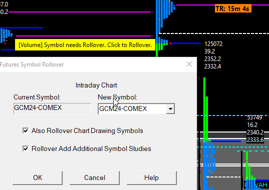 Follow the instructions here to change the symbol of the chart to the next contract month: Changing the Symbol of a Chart This will be the August 2024 GC gold contract you will want to change to. Sierra Chart Support - Engineering Level Your definitive source for support. Other responses are from users. Try to keep your questions brief and to the point. Be aware of support policy: https://www.sierrachart.com/index.php?l=PostingInformation.php#GeneralInformation For the most reliable, advanced, and zero cost futures order routing, use the Teton service: Sierra Chart Teton Futures Order Routing Date Time Of Last Edit: 2024-05-29 21:38:42