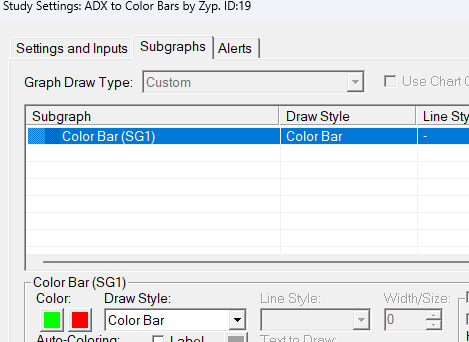 Hello, I ahve a study ADS to color bars which has only 1 subgraph but has 2 colors red and green. I would like to use this subgraph in an other formula but i can't determine which formula can help me highligh when a bar is red or green, i tried some things like ID19.SG1>0 or <0 or with 1. Do you know how to do this ? I attached a screenshot of the subgrpah window. Thanks and regards |