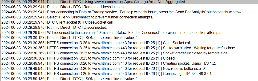 We want you to update Sierra Chart to the current version. Instructions: Software Download: Fast Update And see if that resolves the JSON parsing error. Sierra Chart Support - Engineering Level Your definitive source for support. Other responses are from users. Try to keep your questions brief and to the point. Be aware of support policy: https://www.sierrachart.com/index.php?l=PostingInformation.php#GeneralInformation For the most reliable, advanced, and zero cost futures order routing, use the Teton service: Sierra Chart Teton Futures Order Routing |