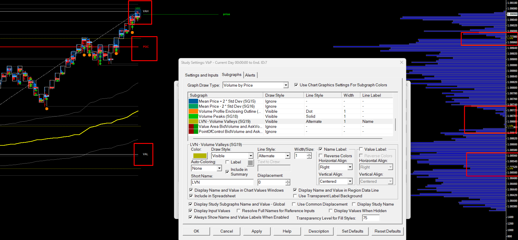 Hi all, currently I am experiencing an issue with Name Labels in VbP for Volume Valleys, it displays not where it suppose to in chart region, but on price region. See screenshot for visual reference. Any walkarounds for this? Difference between POC,VAH,VAL to LVN |