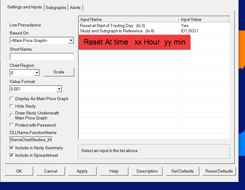 The source code for that study comes with Sierra Chart. It's located in C:\SierraChart\ACS_Source\Studies8.cpp, line 983. You can make your own copy and change whatever you want. For example, you can replace the "reset at session start" with a "Reset at" list containing the options: - Session start - Specific time Then add another study input for the time, which would only be used when that option is selected. |