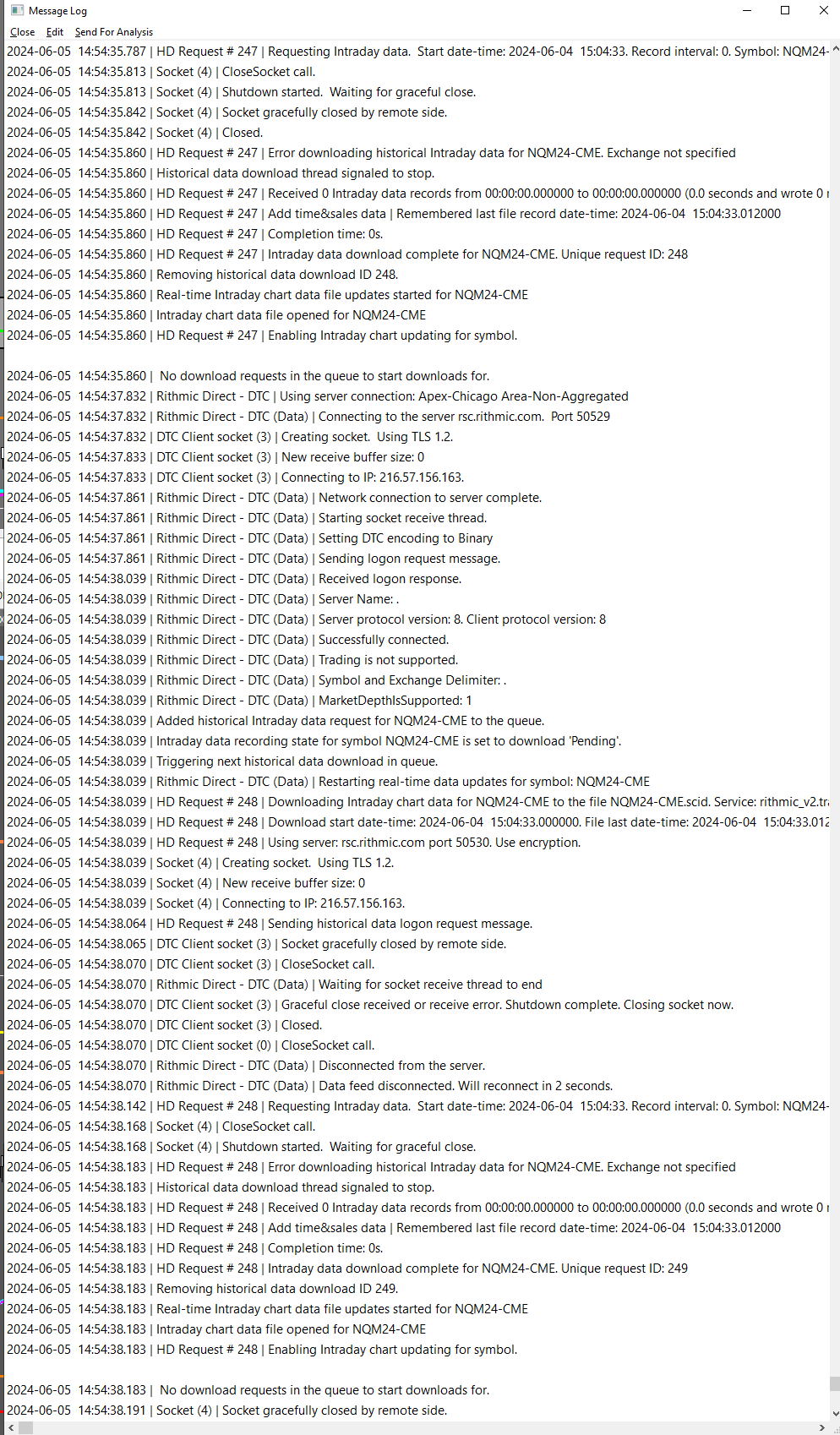 You have the wrong symbols for Rithmic. As such, Rithmic will keep disconnecting and connecting. Select "Edit >> Translate Symbols to Current Service" to change the chart symbols to what is needed for Rithmic. If you continue to have an issue after that, then go through the different areas called out in the following link to look for and update or remove other possible symbols that could be causing an issue: Chart Data and Chart Data Files: Cleaning Up Old and Unused Symbols for Efficiency For the most reliable, advanced, and zero cost futures order routing, use the Teton service: Sierra Chart Teton Futures Order Routing |