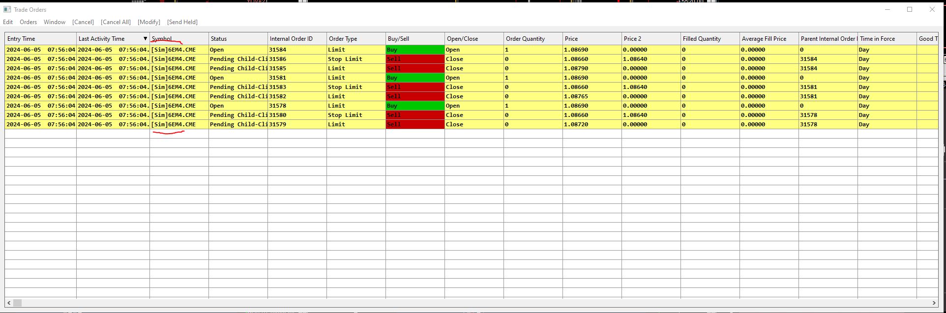 These are definitely not simulated orders: https://www.sierrachart.com/Download.php?Folder=SupportBoard&download=101901 They are orders with Rithmic. This is 100% clear because they do not contain [Sim] ] by the symbol Exit from Sierra Chart, and delete the TradeOrdersList.data file. Sierra Chart Support - Engineering Level Your definitive source for support. Other responses are from users. Try to keep your questions brief and to the point. Be aware of support policy: https://www.sierrachart.com/index.php?l=PostingInformation.php#GeneralInformation For the most reliable, advanced, and zero cost futures order routing, use the Teton service: Sierra Chart Teton Futures Order Routing Date Time Of Last Edit: 2024-06-14 21:17:59