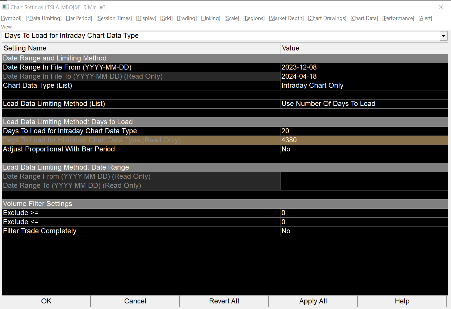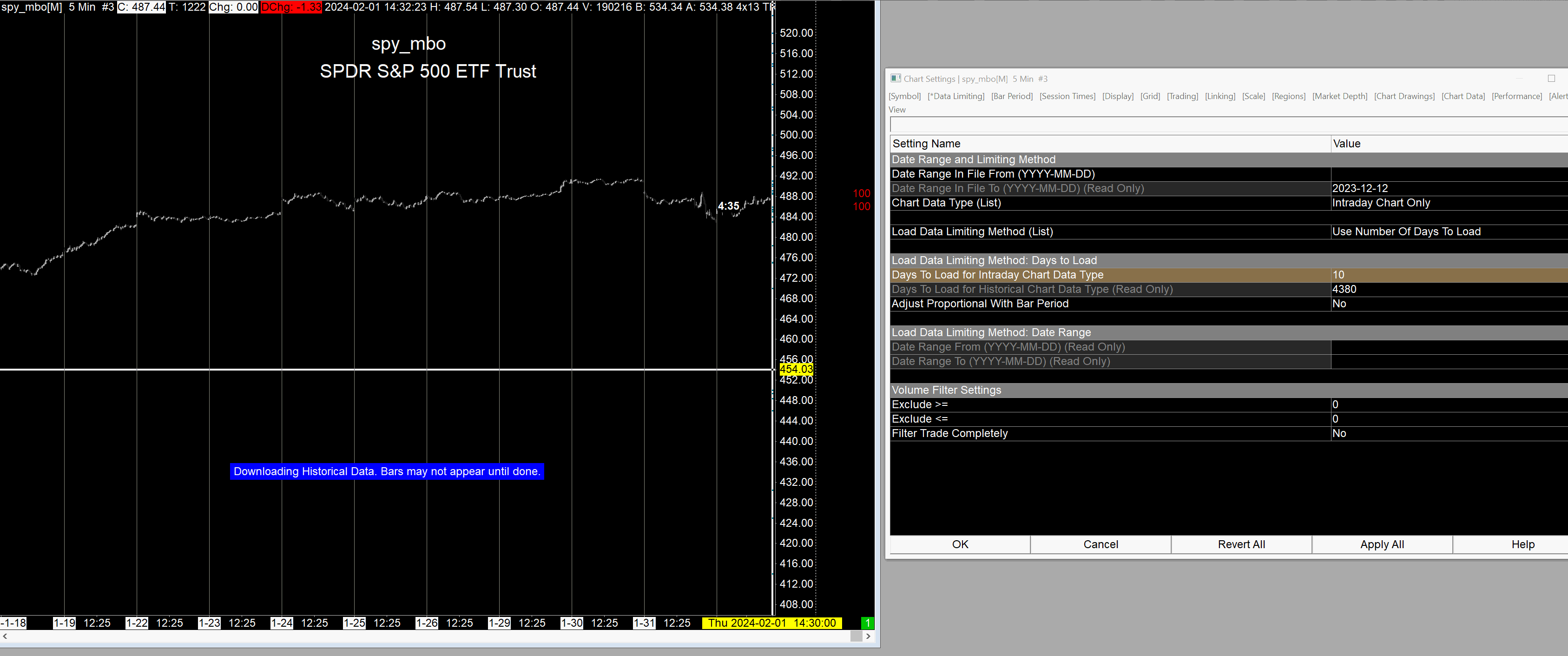 The setting referenced previously is the one that controls how much data is initially downloaded for a symbol that has not had data previously downloaded. What are these settings - "Global Settings >> Data/Trade Service Settings >> Common Settings >> Maximum Historical Intraday Days to Download" set to?