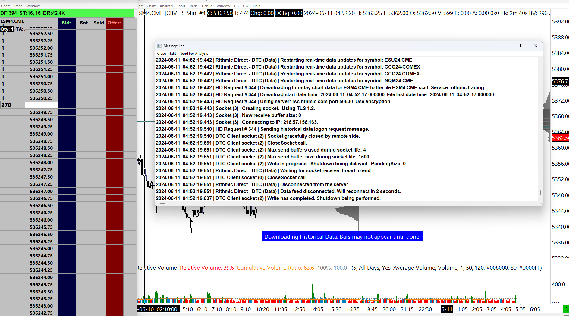 We see a disconnect from Rithmic in the piece of the log you have showing. Most likely what is occurring is that Rithmic is connecting and disconnecting due to a symbol that does not meet their format. You would need to go through your system and see if there are any symbols that are not set correctly for Rithmic and then either remove or update them. The places to look for the symbols are all described in the following section, even though this section is for removing symbols, you can update if you prefer: Chart Data and Chart Data Files: Cleaning Up Old and Unused Symbols for Efficiency For the most reliable, advanced, and zero cost futures order routing, use the Teton service: Sierra Chart Teton Futures Order Routing |