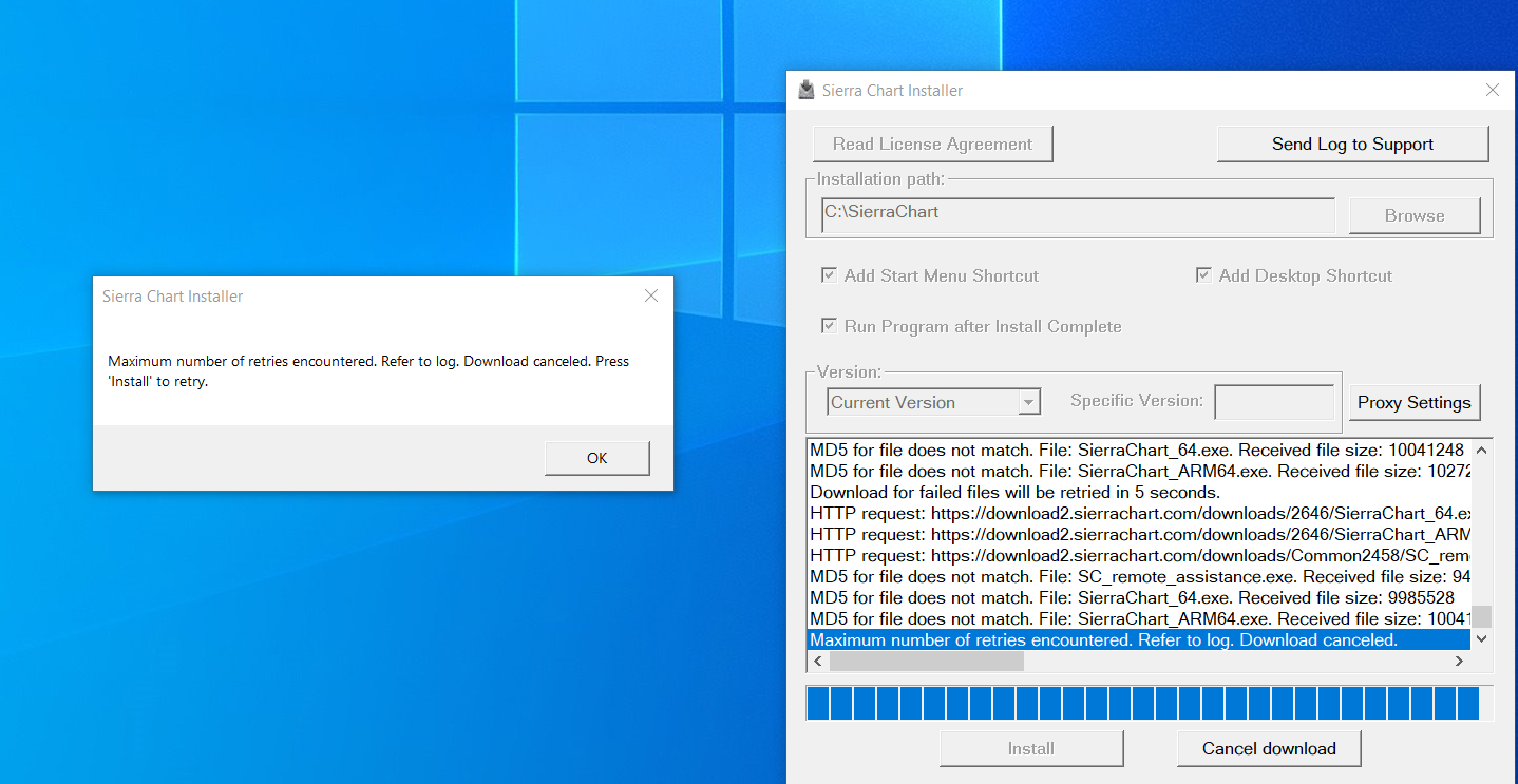 You may be affected by the problem described here: Sierra Chart Internet Connectivity Related Issues We are changing the Internet connectivity this evening for our web services. Hopefully this will resolve the problem. Please try downloading Sierra Chart again tomorrow morning. Use this installer: https://download2.sierrachart.com/downloads/SierraChartFileDownloader.exe And let us know if the download speed is much better. We need to know. Sierra Chart Support - Engineering Level Your definitive source for support. Other responses are from users. Try to keep your questions brief and to the point. Be aware of support policy: https://www.sierrachart.com/index.php?l=PostingInformation.php#GeneralInformation For the most reliable, advanced, and zero cost futures order routing, use the Teton service: Sierra Chart Teton Futures Order Routing Date Time Of Last Edit: 2024-06-14 14:55:00