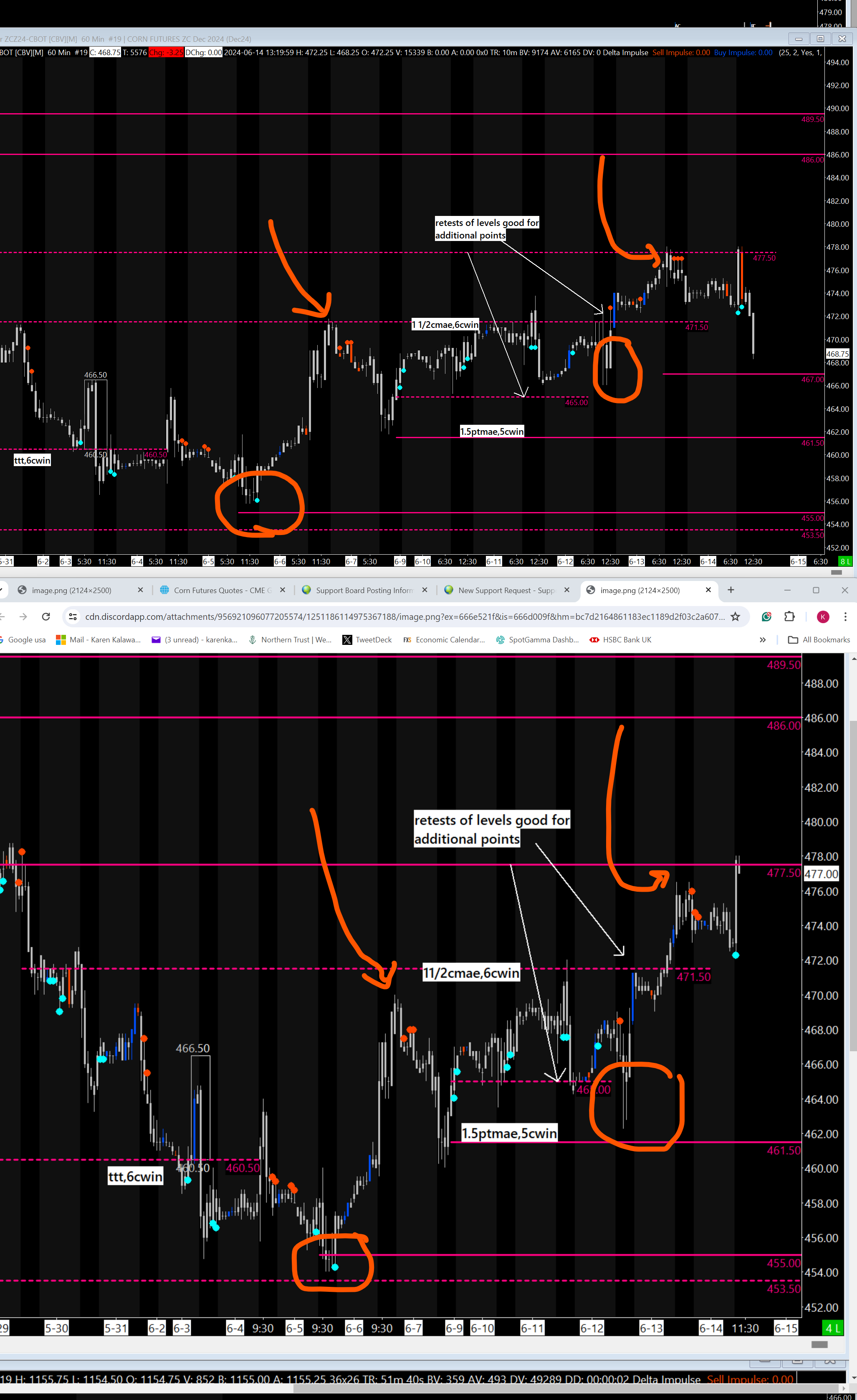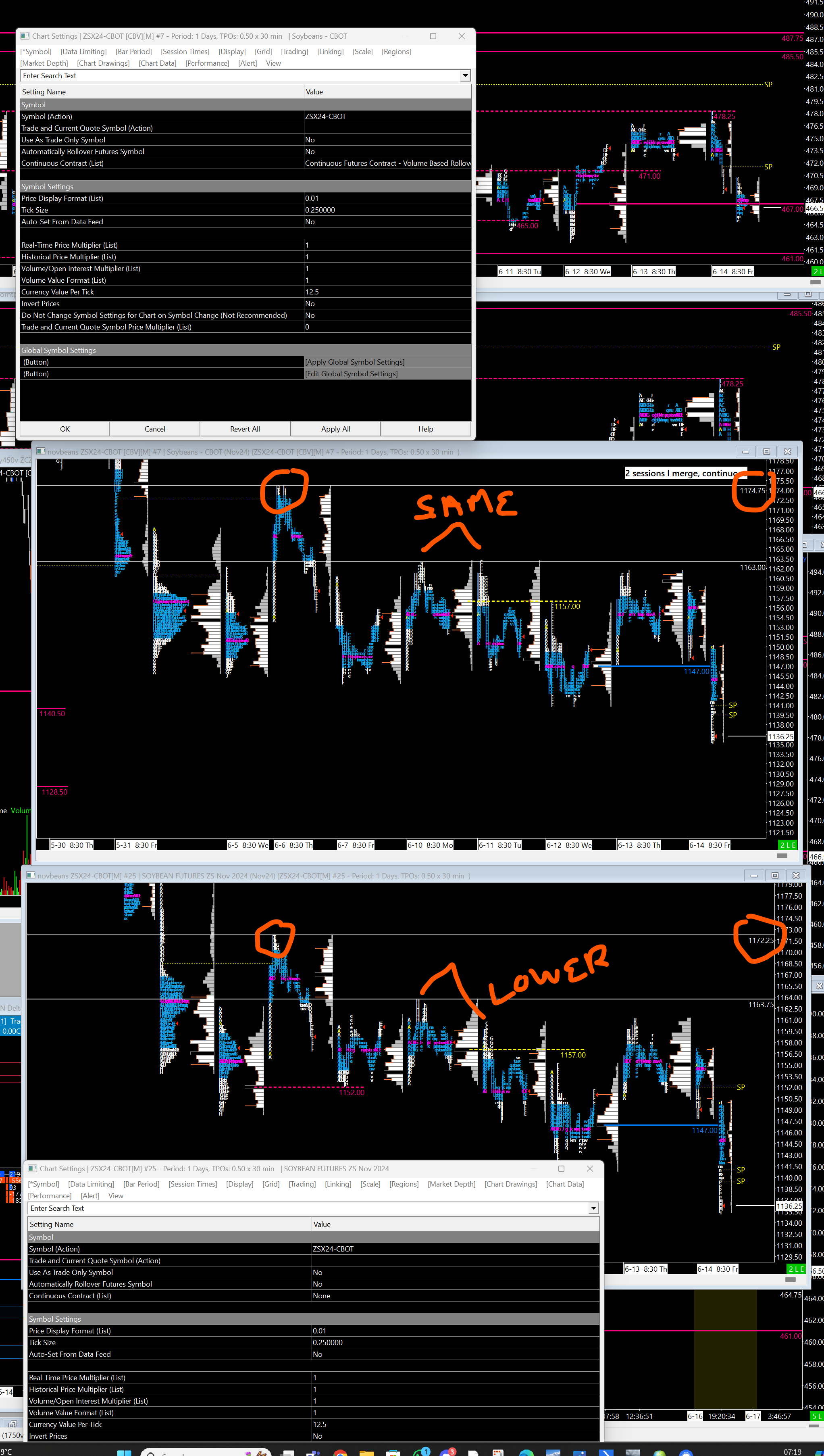 John, there is something very odd happening with my cbot corn and bean charts, and I have timestamped proof to show you. I just started charting them and created a chartbook. On Thursday I noticed everything looked totally different from the day before. Pocs moved, highs and lows moved, and I thought I was going crazy. I fixed everything and took a screenshot-clearly dated in the first attached file. I have taken that saved screenshot and opened it directly under the tpo as it appears now on Sat afternoon. Look at the 5th of June. On the saved screenshot from 13th, it is clearly 453.75, and the volume poc that day is highlighted with a pink horizontal line. Now look above at what I opened this morning. TOTALLY different chart. The low on the 5th is now 456, and the volume poc has equally jumped up. I DID NOTHING from last night and closing down my SC, to this morning restarting SC. Nothing. For further proof, late yesterday afternoon I sent a friend a screenshot of my 60-minute charts in corn and beans on Discord which is attachment 2 showing my conversation with her and the charts. Attach 3 is that saved file image below what I now see on my screen. The charts are utterly different as you can see. Have you any idea what is happening now twice? How in the world does everything about the structure of the charts change when I did nothing but close down SC for the night and reopen it in the morning? I changed nothing and touched no settings. I haven't a clue now what is any legit high or low. And soybeans are exactly the same. I don't need to send you those too, but charts all different highs, lows, structure... Please can you help me? Again, I have done nothing to the settings. Only closed it down with charts looking one way, and when I reopened they are nothing like what they were the day before. I have never ever seen this. |