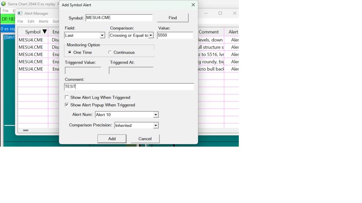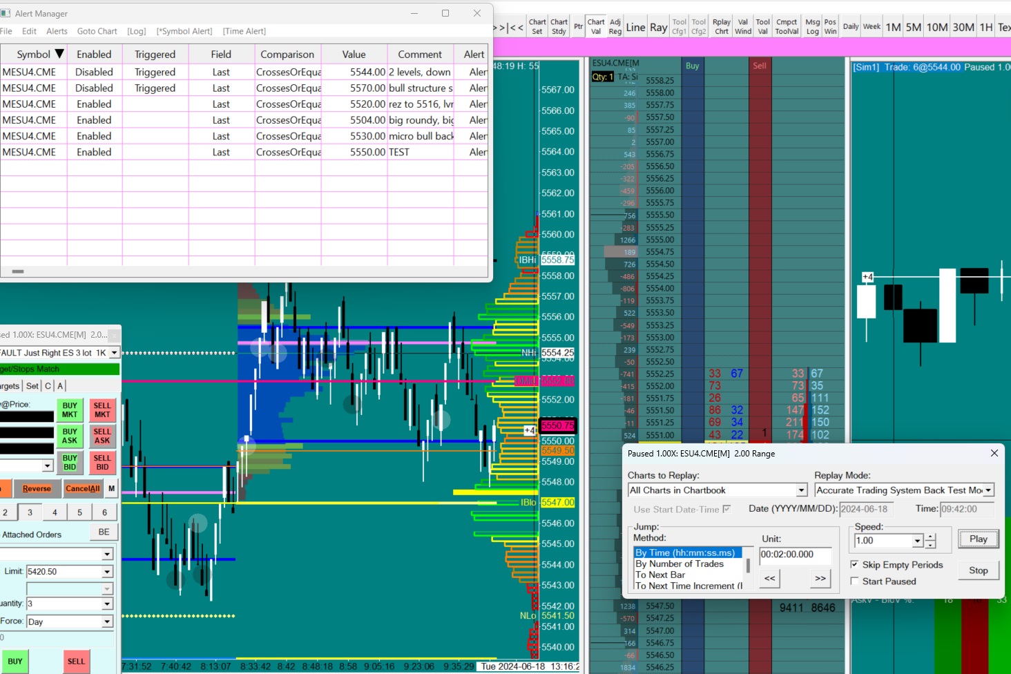 Sorry, we were not thinking of the "Symbol Alerts" when we stated that Alerts work in replay. The Symbol alerts do not, as these use the Current Quote Data from the data feed. Refer to the following: Alerts Manager: Symbol Alerts The standard "simple alerts" and drawing alerts do work during a replay. For the most reliable, advanced, and zero cost futures order routing, use the Teton service: Sierra Chart Teton Futures Order Routing |