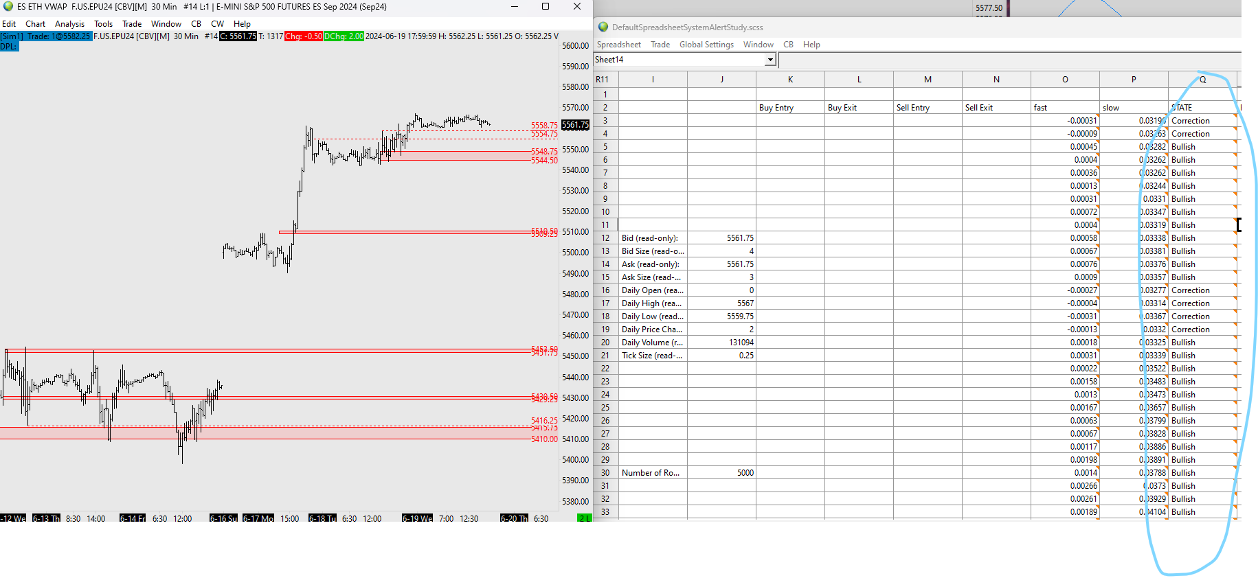 You would need 3 or 4 copies of the "Color Bar Based on Alert Condition". You need 3 if you want to set the standard color for the bars to be one of the states, otherwise you would need 4 to do all the coloring for you. Then in each copy of the "Color Bar Based on Alert Condition" you would need to enter the condition that creates the "Bullish", "Bearish", "Rebound", and "Correction" states. Make sure that each condition is exclusive to each situation (i.e. do not do something like "H > 1000" and "H > 1500", you would need "OR(H > 1000, H < 1500)" and "H > 1500" (assuming the H > 1500 is a final condition)). Refer to the following: Color Bar Based on Alert Condition Study/Chart Alerts And Scanning For the most reliable, advanced, and zero cost futures order routing, use the Teton service: Sierra Chart Teton Futures Order Routing |