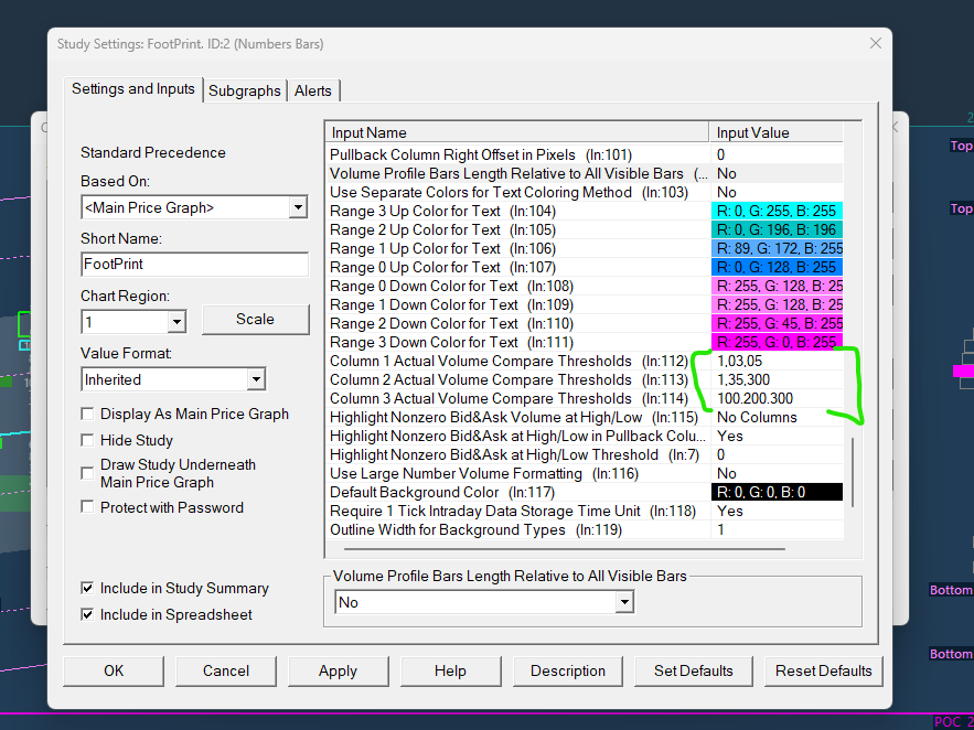 Refer to the following: Numbers Bars: Column # Actual Volume Compare Thresholds For the most reliable, advanced, and zero cost futures order routing, use the Teton service: Sierra Chart Teton Futures Order Routing |