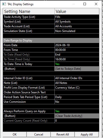 I am also missing the last day of trades from my TAL. Realtime trading (not replay) in SIM mode. The missing trades were there earlier in the day. Then after I did some work with another SIM account and went back to his SIM account TAL, the trades were missing. There should be 5 trades in the TAL, but only the first 3 are displayed. I promise the date settings are correct. And Symbol settings. Edit>>Disable Trading Activity Log is not checked. Edit: as a separate issue, I also note the following TAL behavior: 1. Run a SIM replay using Sim1 account. Trades are visible. 2. For the TAL Display Setting, switch to Sim2 account. Click apply. Trades for Sim1 disappear as expected. 3. Then using Display Settings, switch back to Sim1 account, and now the trades are all gone. I never cleared the trades, yet they are gone. Date Time Of Last Edit: 2025-02-14 08:23:43