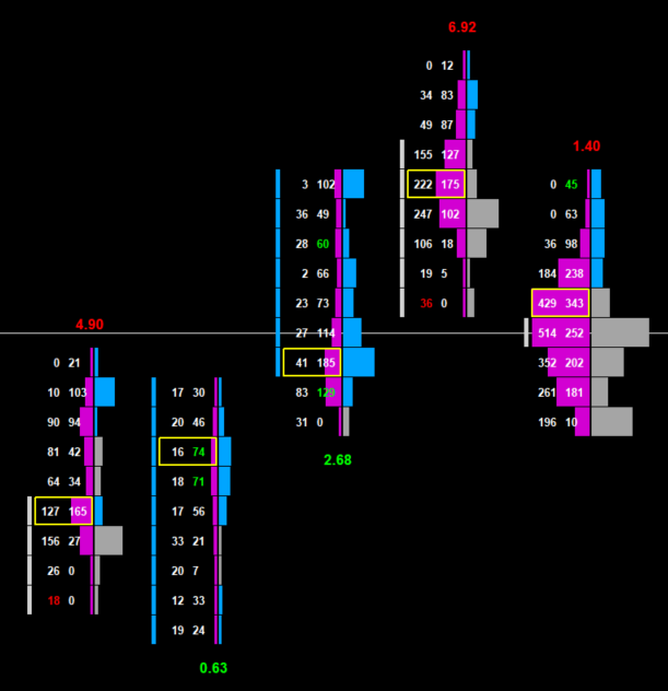 I have a footprint chart with additional calculated values (Low Bid Volume Percent & High Ask Volume Percent). I am using the Number Bars Calculated Values in combination with Color Bar Based Alerts + Study Subgraph Above/Below Bar as Text. This is already working as you can see in the attachment. - bearish candle --> show High Ask Volume Percent, above bar, red color - bullish candle --> show Low Bid Volume Percent, below bar, green color Now I am trying to add additional conditions. I only want to see: - values equal 30 and above - values equal 0.7 and below All other values should be removed. Is it possible to do this and how can I do this? |