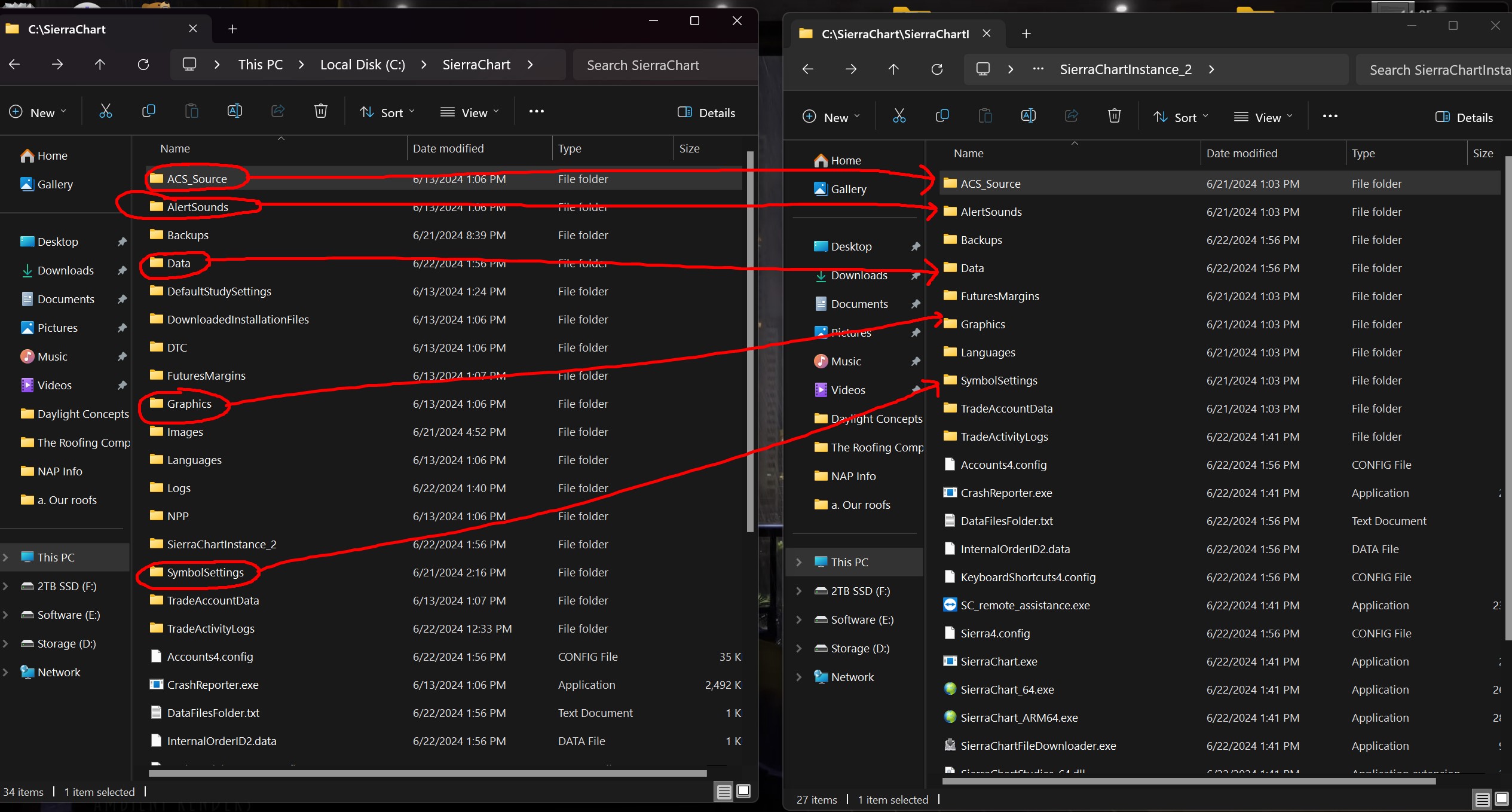 Before posting I used the search and found this Transferring Sierra Chart Settings and Data From Existing Installation to New Installation: Transferring Sierra Chart Settings and Data From Existing Installation to New Installation but it talks about installing sierra on another computer or "another folder". I don't feel I am doing this because the sierrchartinstance_2 folder is within C:\SierraChart Before I go messing up hours of work I want to clarify I am taking the right steps before continuing. Take a look at this screen shot. I was just going to take all these highlighted folders and overwrite the contents of those folders within the C:\SierraChart\SierraChartInstance_2 folder. Is this the correct way to go about transferring everything over? EDIT: Nevermind I just did it and it worked. i don't need help Date Time Of Last Edit: 2024-06-23 19:27:56