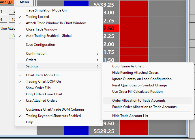From what I've seen this is possible. You'd need to connect the accounts then can click "Menu" on the DOM, highlight "Settings", then select "Order Allocation to Trade Accounts". You then select the master account and add the others. The multiplier refers to what multiple of lots in the master you want to trade in the remaining accounts. For example, a multiple of 1 equates to trading the same lot size across all accounts. See attached screenshot. |