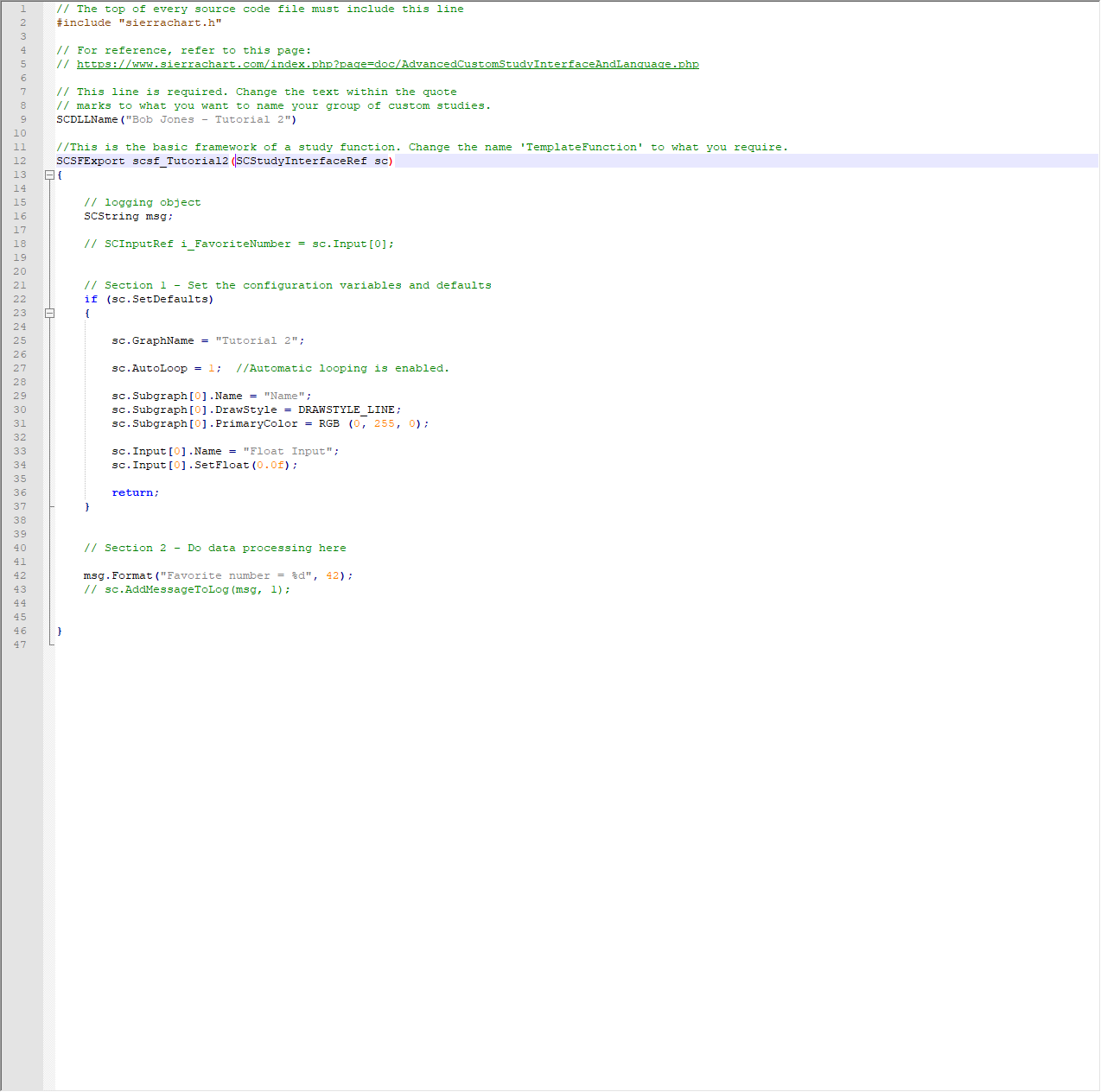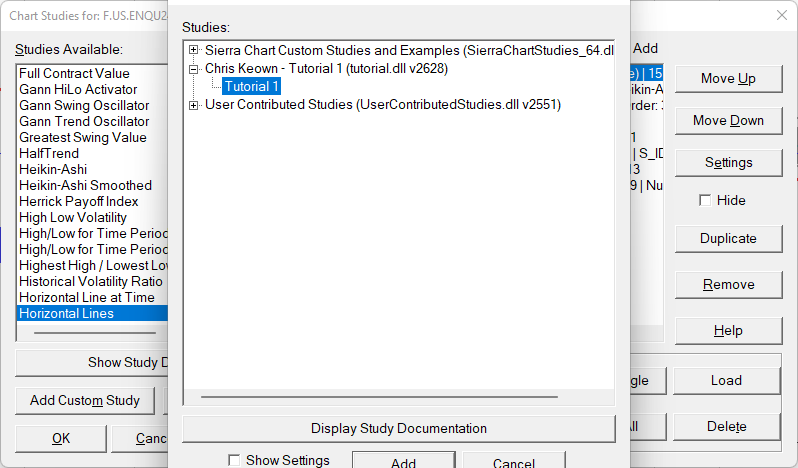 Hello, I have created a custom study and am trying to add it to my chart, but it's not showing up in the custom study list, although the file ("C:\SierraChart\Data\tutorial_02_64.dll") is in the appropriate directory. This is a study that I custom coded and compiled using the remote build function. This is the second study I've made, and the first one showed up just fine. I'm not sure what has changed. I have also restarted SC but no luck. I attach a screenshot of the code as well as the interface where you add the customer study. |