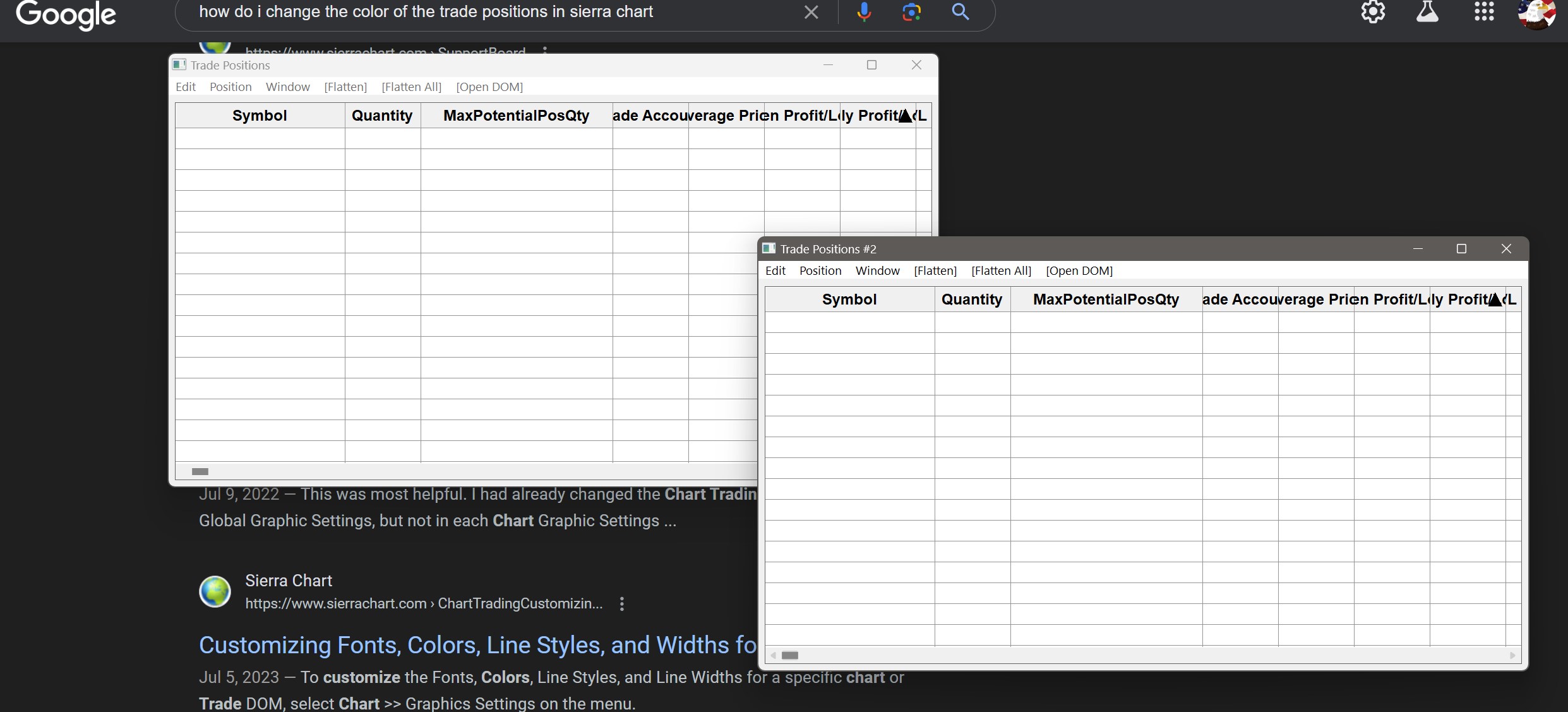 This is a "General Text Window", so the graphics settings that start with "General Text Window" are the items to change. In particular the background is controlled by the "General Text Window Background Color". Note that you may need to close and re-open the Trade Positions window to see the color change after you have changed it in the graphics settings. For the most reliable, advanced, and zero cost futures order routing, use the Teton service: Sierra Chart Teton Futures Order Routing |