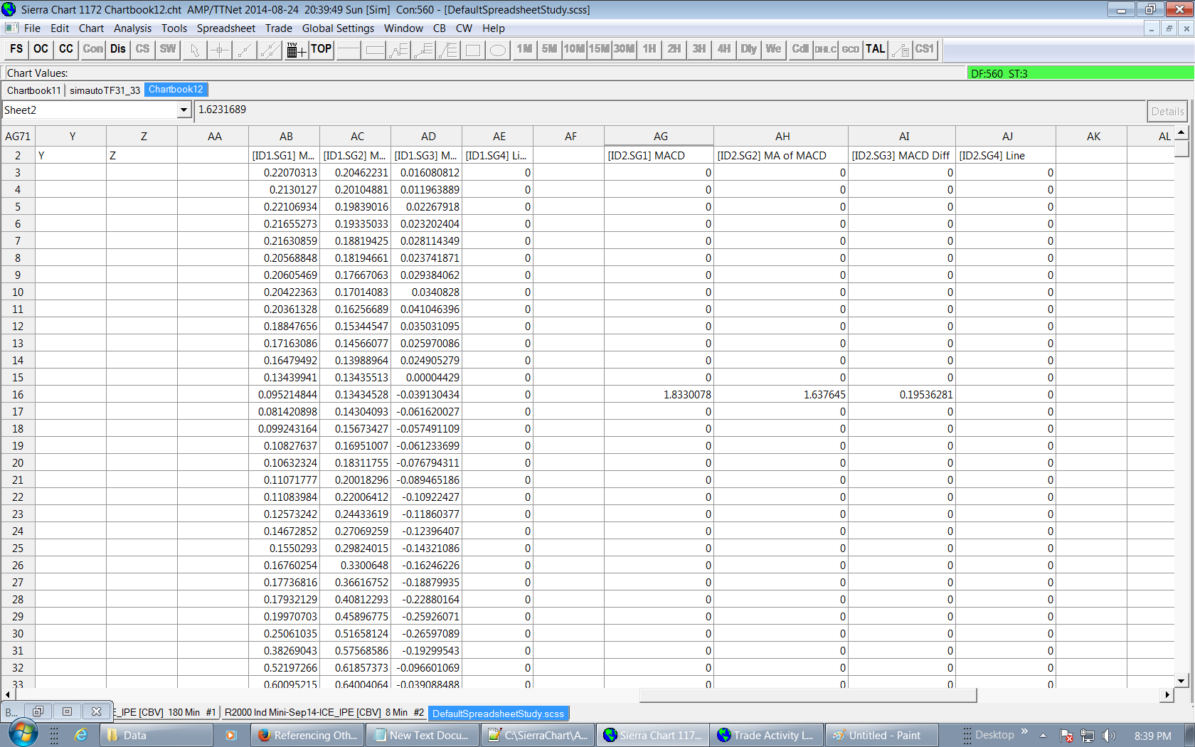 Hi I want to reference a study from a 180minute chart in my current chart of 8 min. After adding the study overlay, I am not sure what range to use in the spreadsheet when referencing the study. In the attached image, you see the macd numbers from the 180 minute chart in columns ag and ah and they skip several rows. I want to use a formula including ag>ah ( macd > macd mov av). Usually I would use ag3:ag4 > ah3:ah4. It seems that would not work here, so how many cells do you have to reference in this case ? see attached image. thanks shane Date Time Of Last Edit: 2014-08-25 00:49:49