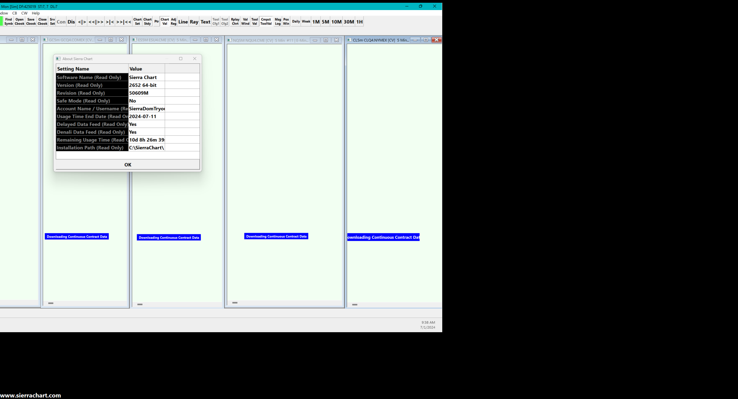 Hello Sierra Charts, I was on version 2634. Did not know that I needed to upgrade to version 2652. I trade off the DOM on each chart I watch. This morning I experienced child orders that were not cancelled after the target or stop were hit. So I hit cancel a few times in a row. Then the whole connection into Sierra Charts with a Rithmic feed disconnected. When I tried to restart, the charts just say, "Downloading Continuous Contract Data" and they never load. I came to the support board. I noticed that I needed to upgrade to Sierra Charts so I downloaded and installed the current version. I am on version 2652. However, the charts will still not load. I am a OneUpTrader. Here is a screenshot of what I am seeing. https://www.sierrachart.com/image.php?Image=1719848332269.png Usually SC is rock solid. Please assist. I am dead in the water here! Thanks! Date Time Of Last Edit: 2024-07-01 16:15:06