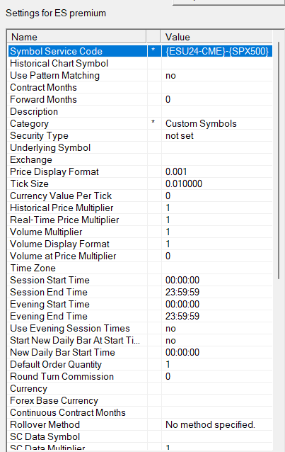 You have the Symbol setup with "Premium ES" as the symbol. You can not do this. The Symbol must be the actual formula you want, so the symbol itself will be the following: {ESU24-CME} - {SPX500} Leave the "Symbol Service Code" blank. Refer to the instructions here: Custom Calculated Symbols: Instructions For the most reliable, advanced, and zero cost futures order routing, use the Teton service: Sierra Chart Teton Futures Order Routing |