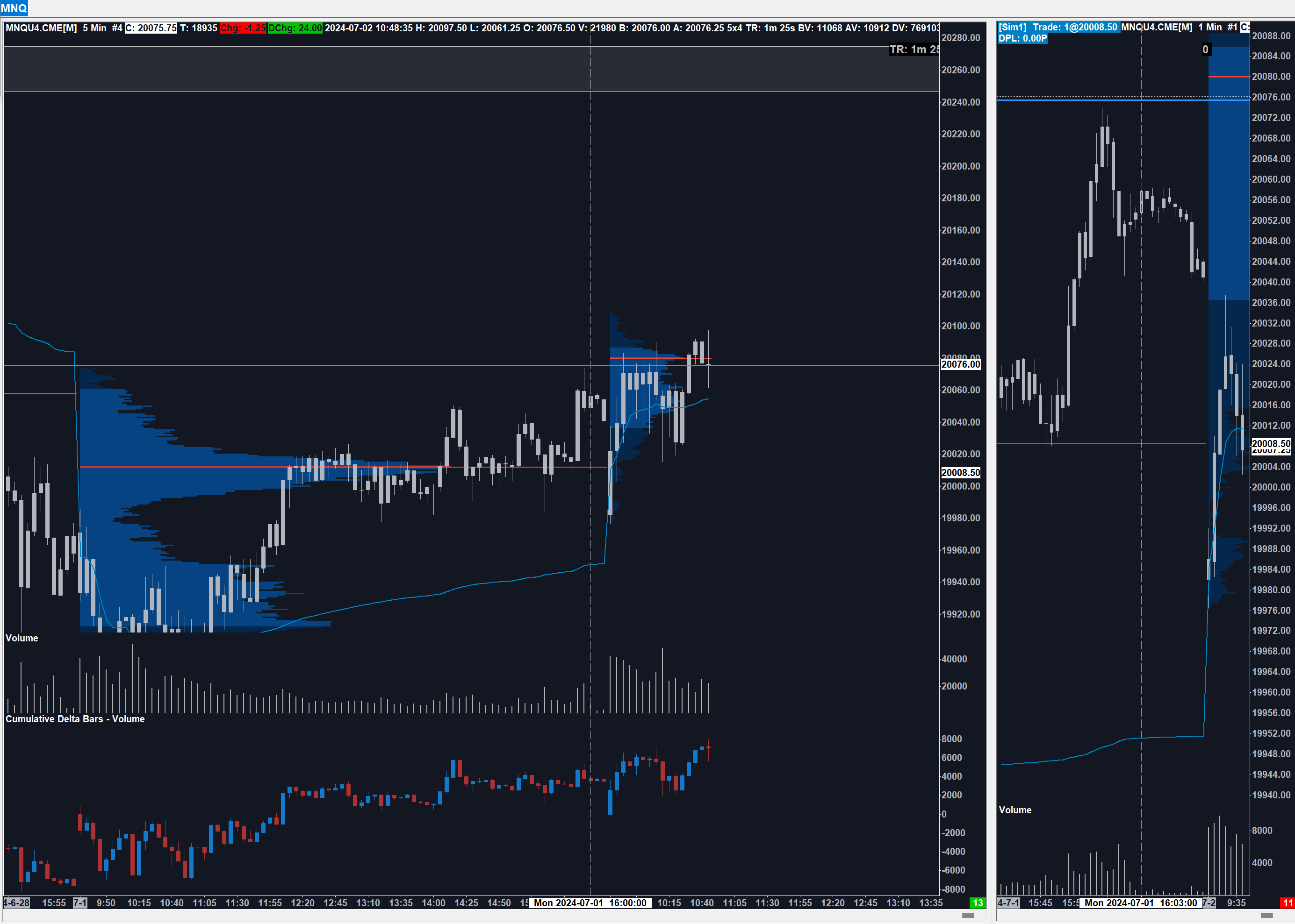 In the 5 minute chart I have set "ticks pre row" to 4 and in the 1 minute chart to 1. I can see that if both are set to 1 then the VPOC is the same. But that can't be the solution because otherwise my chart is very laggy if I have the volume profile at 1 tick in the 5 minute chart (and I have a very powerful PC that shouldn't really have any problems with that). |