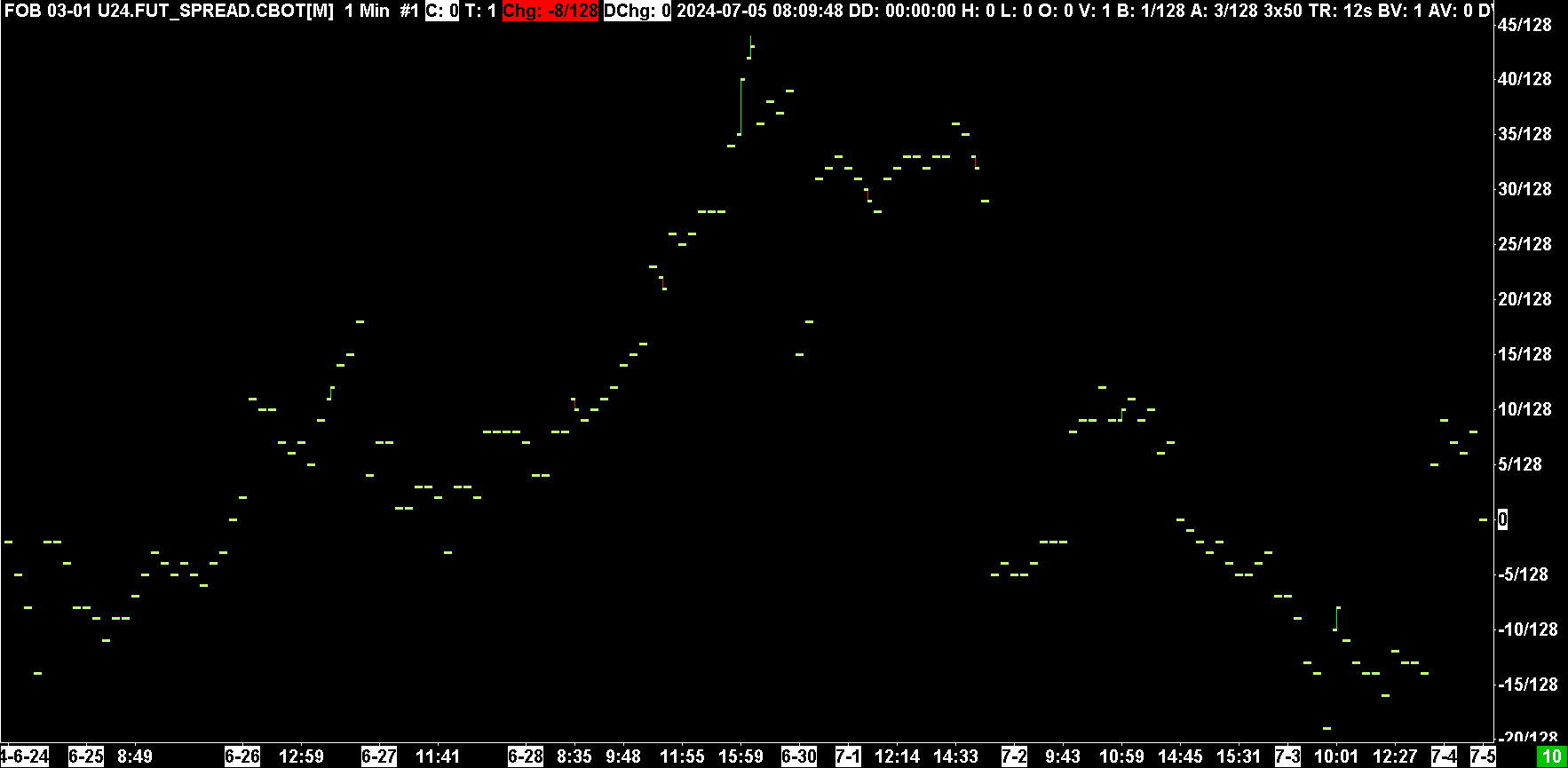 We are sure there is no missing data. But it is best you ask the exchange so you can get confirmation. We have no reason to check with the exchange because we know there is no problem. You need to check with the exchange so that you can get the information from an authoritative source. We do not know who to contact there. Spreads do not update, even if the underlying is trading. There has to be a trade in the actual spread contract itself. This is what we see for that chart: https://www.sierrachart.com/image.php?Image=1720182332379.png Looks fine to us. That is all the trading that occurred. For July 4 we see no trading at all other than 2 trades in the early morning. Sierra Chart Support - Engineering Level Your definitive source for support. Other responses are from users. Try to keep your questions brief and to the point. Be aware of support policy: https://www.sierrachart.com/index.php?l=PostingInformation.php#GeneralInformation For the most reliable, advanced, and zero cost futures order routing, use the Teton service: Sierra Chart Teton Futures Order Routing Date Time Of Last Edit: 2024-07-05 12:27:34