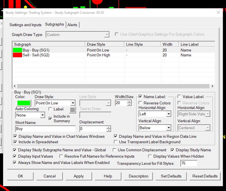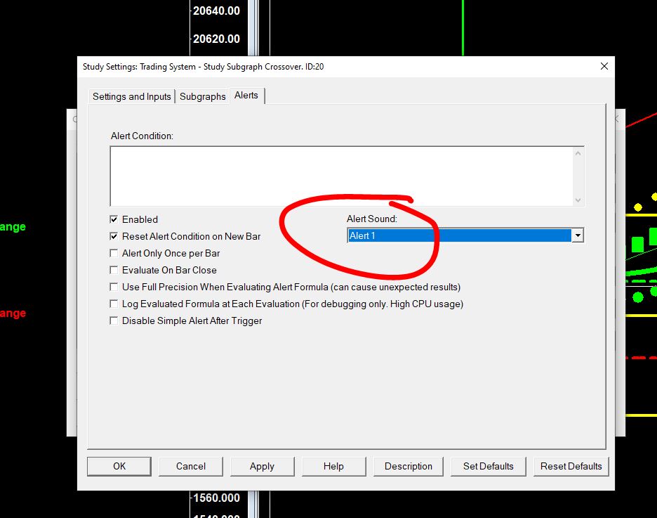 You do not have an Alert Condition defined, therefore you are not getting an alert. In this case, we assume you want the alert to occur when you get a valid condition for this "Trading System - Study Subgraph Crossover" study. In which case, you would enter the following for the Alert Condition: =OR(SG1, SG2) In this case, since the alert is set on this particular study, you do not need to reference the ID of the study. For the most reliable, advanced, and zero cost futures order routing, use the Teton service: Sierra Chart Teton Futures Order Routing |