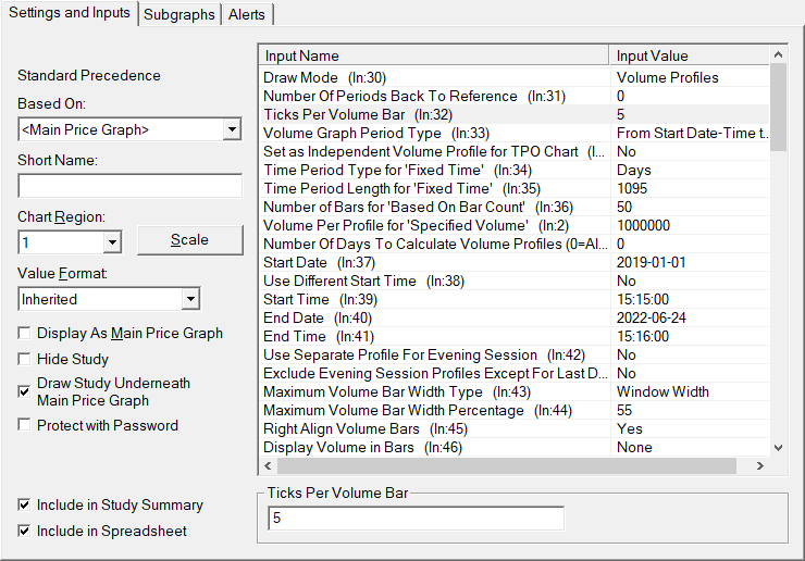 This is documented here: Volume By Price Study: Ticks Per Volume Bar Sierra Chart Support - Engineering Level Your definitive source for support. Other responses are from users. Try to keep your questions brief and to the point. Be aware of support policy: https://www.sierrachart.com/index.php?l=PostingInformation.php#GeneralInformation For the most reliable, advanced, and zero cost futures order routing, use the Teton service: Sierra Chart Teton Futures Order Routing |