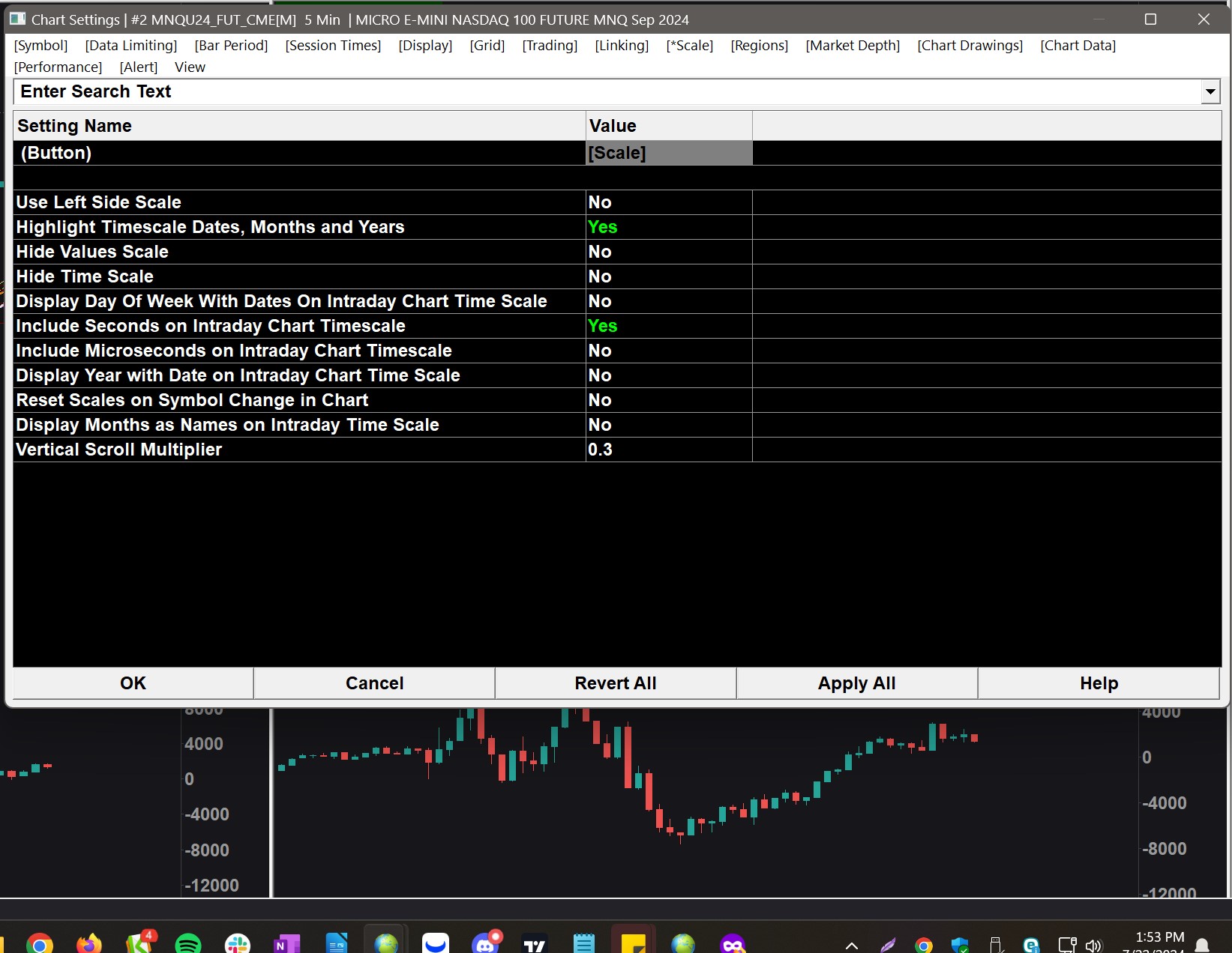 It is not the color, as the horizontal scale uses the General Text color, and since the rest of your text is white, this is not the problem. It looks like your windows are somehow cut off at the bottom. That they are not fully displaying the chart information. Change the size of the chart, or maximize it and see if you have your scale and then adjust from there. There is no offhand reason for why this would occur. For the most reliable, advanced, and zero cost futures order routing, use the Teton service: Sierra Chart Teton Futures Order Routing |