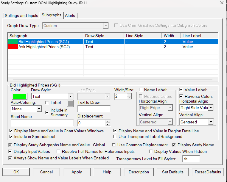 Hello, Assuming you mean to draw within the DOM columns themselves, you cannot use subgraphs for that, you would need to use custom drawing (take a look at gdiexample.cpp in your sierrachart/acs_source folder). When using DRAWSTYLE_TEXT, you actually have to set the text value to something, otherwise the is nothing to display. The value you set in the subgraph determines only the location (price) at which to display the text. Not sure what the purpose of the inner loop here is, given that you are only looking to highlight the price levels. if (sc.GetAskMarketDepthEntryAtLevel(depthEntry, level)) { int askVolume = depthEntry.Quantity; float askPrice = depthEntry.Price; if (askVolume >= threshold) { // What is this loop for, it does not seem to fit with the logic of what you are trying to achieve? for (int i = sc.UpdateStartIndex; i < sc.ArraySize; ++i) { // so you only want to highligt the last trade price, nowhere else? if (sc.BaseData[SC_LAST][i] == askPrice) { sc.Subgraph[1][i] = askPrice; } } } } Also, you have autoloop enabled, but are referencing sc.UpdateStartIndex within the inner loops, which may (not 100% sure) always be 0 when you have autoloop set. If so that will be very inefficient. If your intention is to only draw in the DOM columns, then autoloop should be set to 0, as there is no need for the function to be called on every bar (as it would be with auto loop enabled). Maybe you can provide an example of what you expect to see, or explain in more detail? |