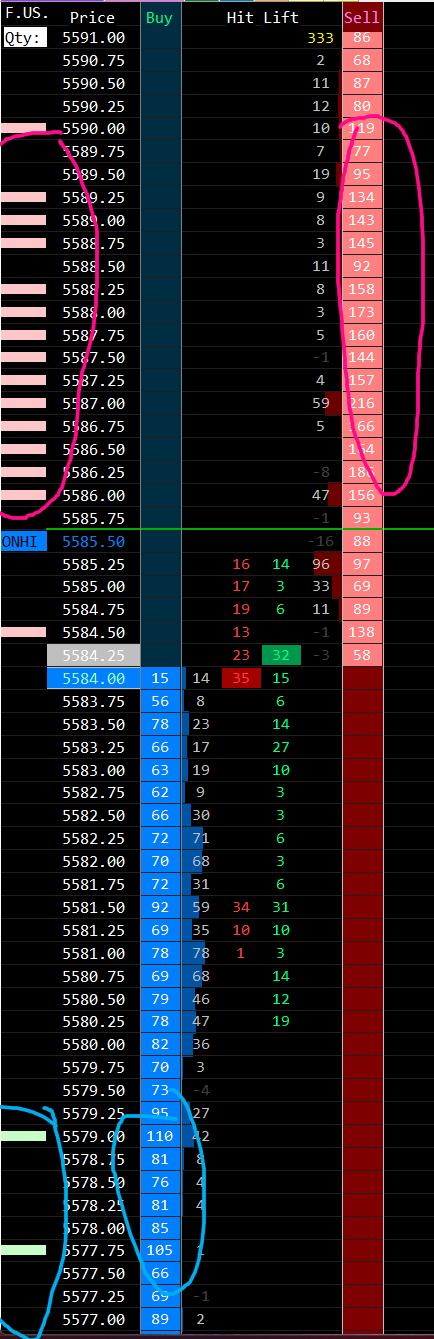 Hi pal Thanks for the reply, I'll do my best to elaborate! Please see attached my Trade DOM, column second and fifth columns along from the price, Bid/Ask pulling/stacking columns respectively. I would like to see the prices where the volume value in the p/s columns are >= 100 (you'll see little "clusters" where the volume bars are in each p/s column. As they flicker and change randomly and constantly, I wanted the study to highlight the price column, similar to have the name/value check boxes do in subgraph, so appreciate the assistance on not needed subgraphs! Does this make more sense? |