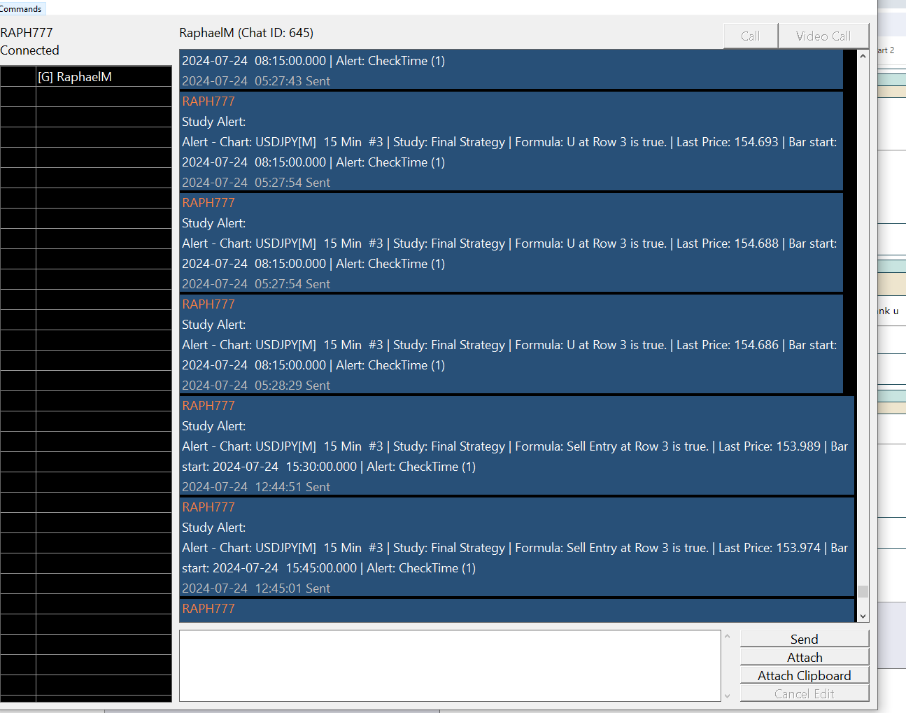 Sorry I don't quite understand what you mean; this is how it is being generated but imaged does not get attached. Is that what u r asking? Study Alert: Alert - Chart: USDJPY[M] 15 Min #3 | Study: Final Strategy | Formula: Sell Entry at Row 3 is true. | Last Price: 153.966 | Bar start: 2024-07-24 15:45:00.000 | Alert: CheckTime (1) |