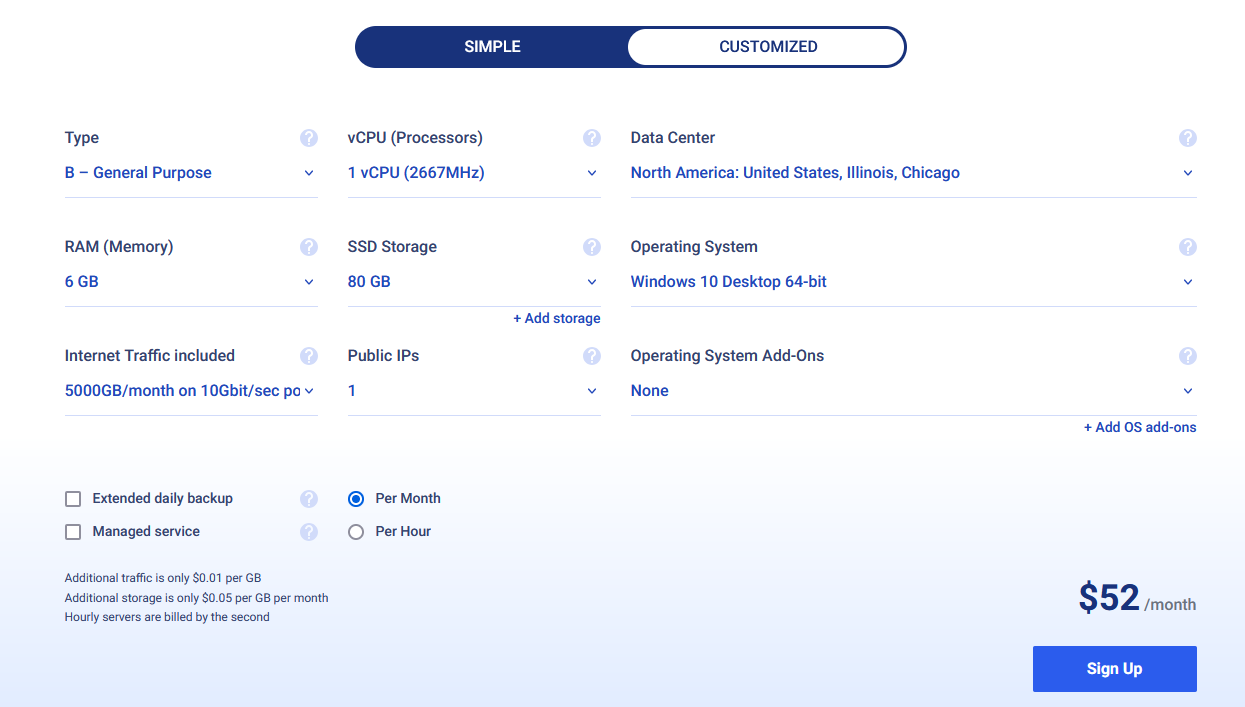 I really appreciate the answer. Thank you for posting. I wasn't expecting 1CPU to be able to pull that weight, but Sierra Chart has a pretty low utilization so who knows? Few more questions if you have the time: 1) Did you do Dedicated (or one of the other options)? 2) Is the storage the amount you have after the Windows 10 install is complete or do you have to factor the operating system taking up disk space? 3) I may run 2-4 CPU (just in case) with 8GB RAM and 100GB of storage: $52/mo. What was your cost? |