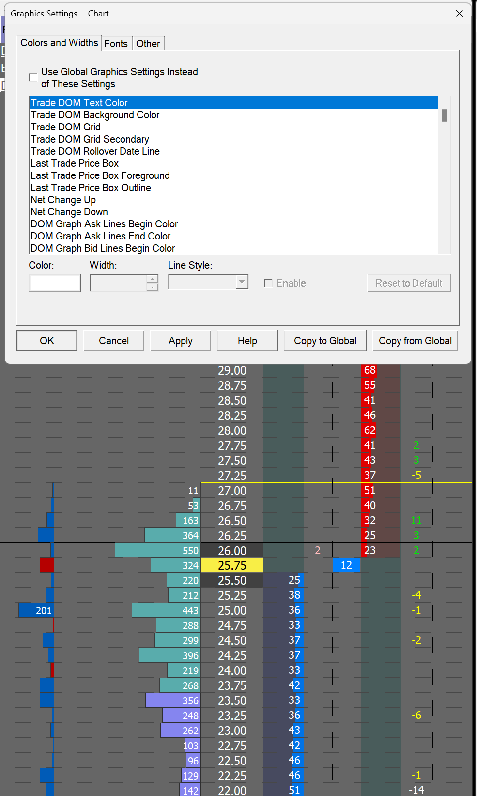Hello SC team. I have looked through the documentation and support threads without getting wiser. I have spent some time customizing a Trade DOMs graphics settings (chart specific graphics, not global). Now I would like to copy these changes I have made, to the Global Graphics settings. I was under the impression that the button "Copy to Global" would take the changes I have made, and overwrite the Global Settings. But, only some of the settings get copied. For example the DOM background is changed, but not the Recent Bid/Ask or buy/sell column backgrounds. The documentation (Graphics Settings: Copy to Global (Chart >> Graphics Settings - Chart)) says "This does not affect any of the Saved Global Graphics settings, only the active settings." This doesn't make sense to me. Could you please clarify what this means? Thank you for your time. |