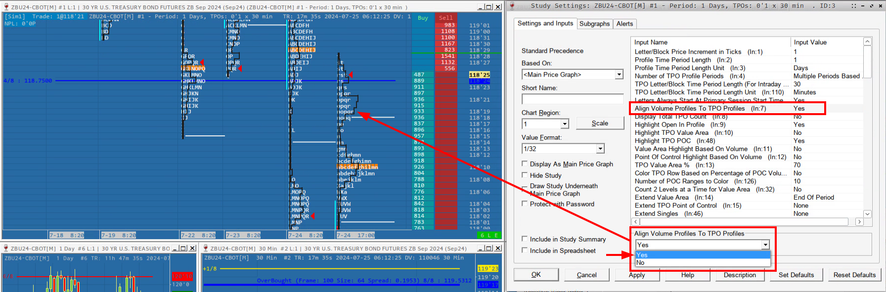 @BigBagel When both the TPO study and a volume profile study are added to the same chart, the TPO study has a setting that controls the position of the volume profile. See the attached image for further explanation + an example. I think the confusion comes from the fact that this is an option that affects the Vol Profile, even though it is in the settings of the TPO Profile study and only takes effect/makes any sense when both studies are on the same chart. Hope this helps. |