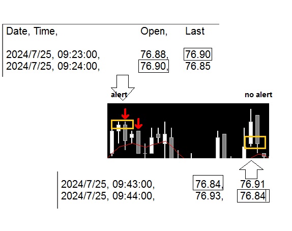 Image shows two sets of highlighted bars. Formula segment shows essentials for shorting conditions for triggering an alert that are based on the second bar's body overlapping or equalling the first bar's body, accounting for this situation in the alert condition. Tan squares mark specific price levels. These levels appear to match and overlap correctly at the opposite ends of the two-candlestick short formations. Both sets of bars seem to satisfy the criteria for triggering a short alert. Despite meeting the criteria, only one example of this scenario has been flagged. Investigating what could cause such a discrepancy between expected and actual alerts. Date Time Of Last Edit: 2024-07-25 23:49:15
