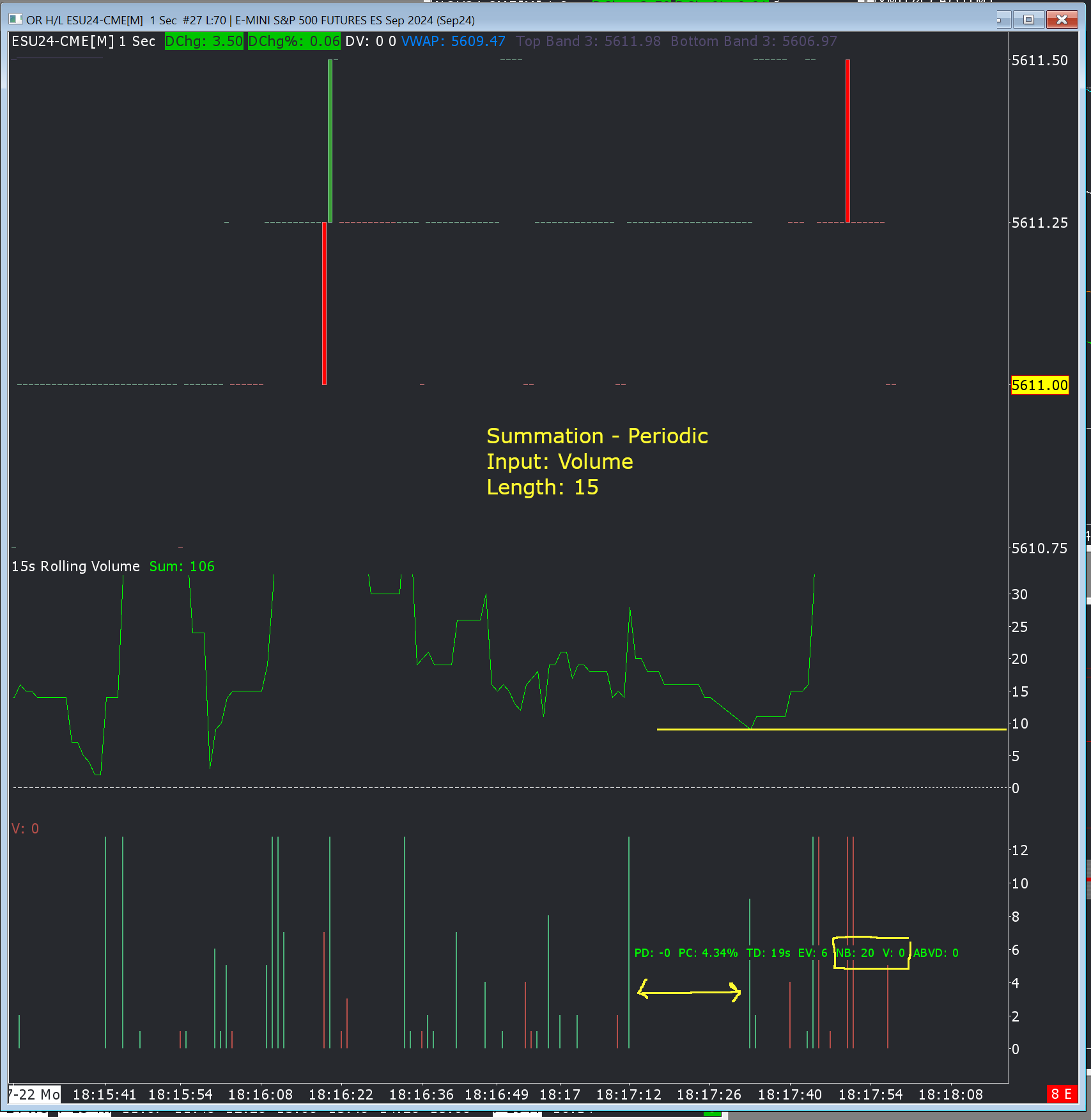 In the attached screenshot, I am showing a 1 second ES chart which is set to draw a bar even if no trades occurred for that period. The second region is the Summation - Periodic study with a length of 15 and input set to Volume. In the third region I included Volume and used the calculator tool to show a 20 second period with zero volume. However, as you can see for that window of 20 seconds with zero volume, the Summation study shows a minimum value of 9. It seems that the study is only updated when there is a bar with a trade. Is this expected? Ideally, the last 5 values of Summation for that 20 second window would be zero. |