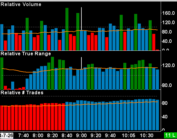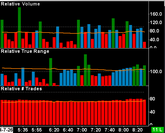 Thanks for considering this observation. I have attached another chart that was a few seconds after the new 5 minute bar commenced. You still see that "Relative True Range" study shows a normal sized bar, despite the young age of the bar. I have also attached an image of the settings for "# Trades" |
